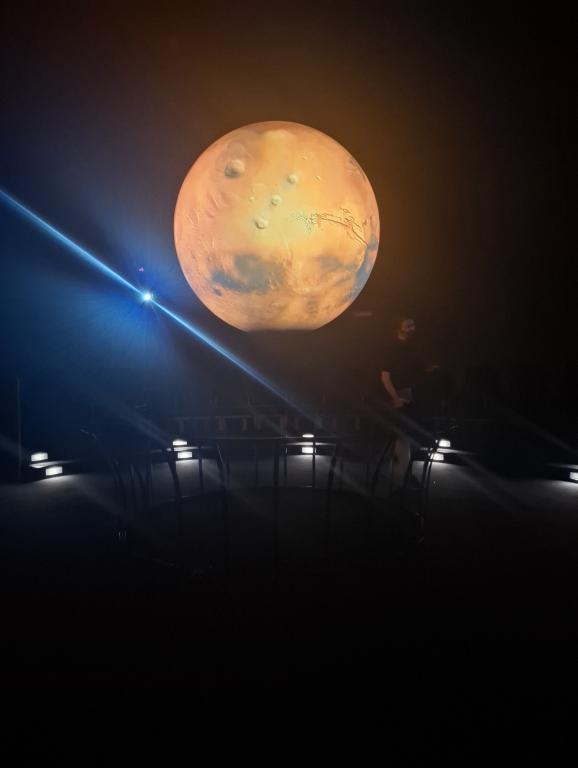 Poté jsme se přesunuli do sálu Science On a Sphere, kde jsme se zúčastnili interaktivního programu Země, Mars a 6 statečných. Tato část byla věnována porovnání podmínek na Zemi a Marsu a žáci si mohli vyzkoušet, co všechno by bylo potřeba pro přežití na rudé planetě. Program rozvíjel kritické myšlení, týmovou spolupráci a probouzel zájem o přírodní vědy.