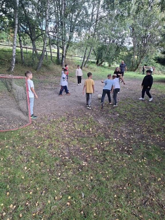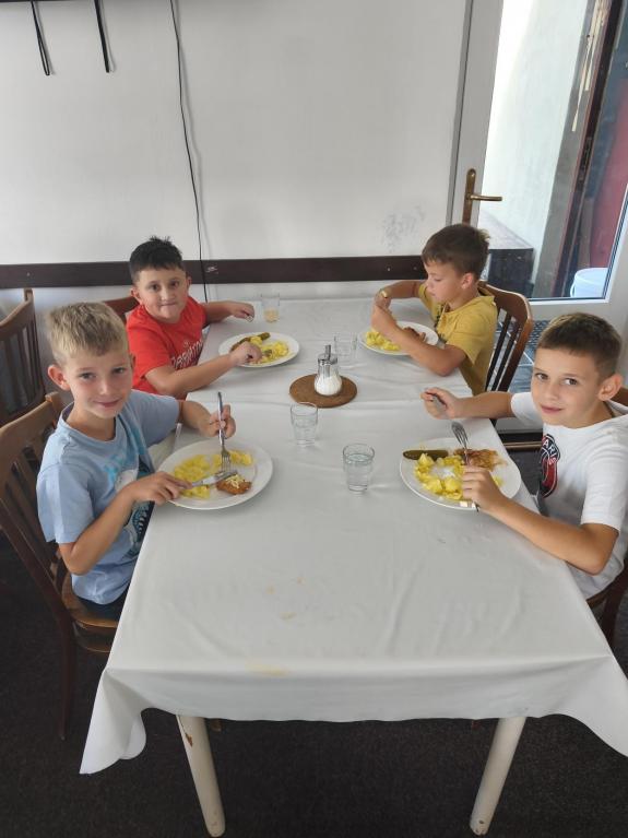 Po návratu na ubytování nás čekal oběd – řízek s bramborem, který všem chutnal. Po obědě následoval polední klid, aby děti nabraly nové síly. Odpoledne se neslo ve sportovním duchu – na hřišti jsme hráli různé pohybové hry.