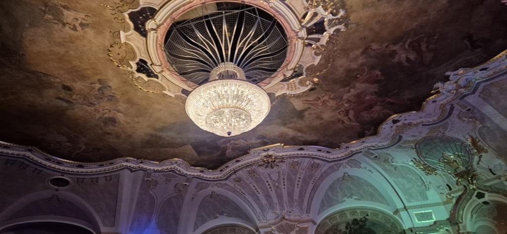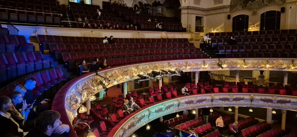 Naše cesta i s jednou zastávkou a včetně tradiční páteční pražské dopravní špičky trvala něco přes tři hodiny, a tak když jsme asi ve čtvrt na sedm vystoupili z autobusu pár kroků od Hudebního divadla v Karlíně, měli jsme tak akorát dost času na to, abychom odložili svršky v šatně, poněkud se občerstvili a pak se již pohodlně usadili v nádherném sále divadla, které je naší nespornou jedničkou v prezentaci hudebních představení všech žánrů.