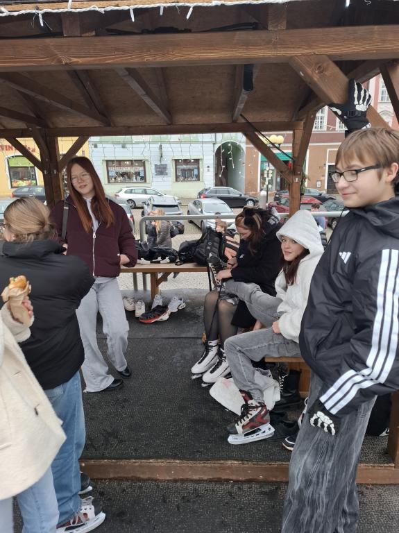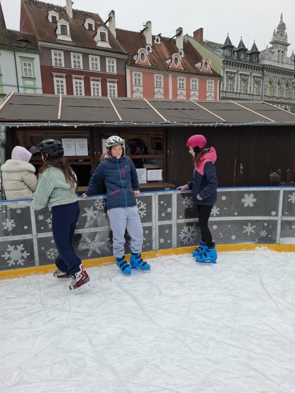Poté jsme se přesunuli na ledovou plochu na chebském náměstí, kde si někteří žáci zabruslili a jiní ochutnali dobroty místních prodejců ve stáncích.