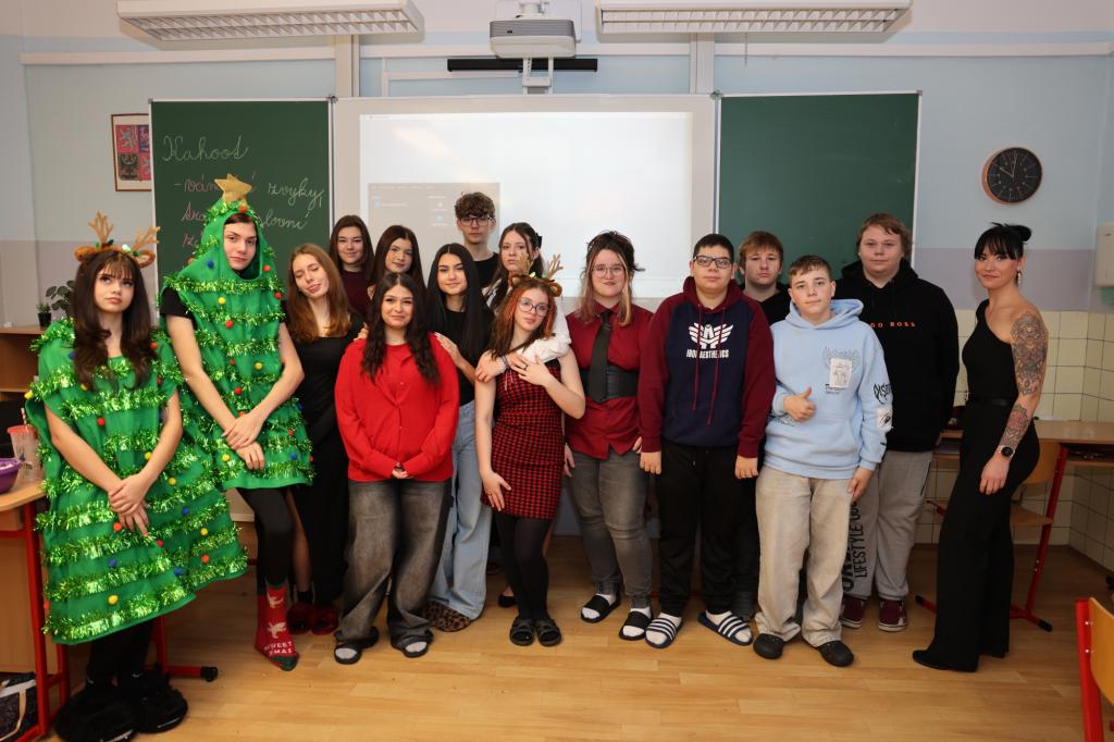 Počtvrté a vzhledem k tomu, že to spolu na druhém stupni táhneme bezmála již čtyři roky, i naposledy jsme 19. prosince, tedy poslední páteční dopoledne před vánočními prázdninami strávili společně při hrách a soutěžích. Myslím, že jsme prožili vcelku fajn několik pohodových hodin, když do programu přispělo svou troškou hnedle několik lidiček. Já si připravil obměnu legendární hry Kufr a podle postupně odkrývaných fotografií také poznávačku míst v našem městě, Honza s Lukym přichystali tematický Kahoot, Káťa pak vyzkoušela naši znalost českých pohádek a filmů, kterým jsme měli přijít na kloub díky audioukázkám a Nikita s Jusťou nachystaly sváteční šibenici. Došlo samozřejmě i na nějaké ty tradice, dárečky a ochutnávku cukroví. Pro každého ze své třídy jsem nechal vyrobit originální ozdobu, která jim snad i za dlouhá léta bude připomínat roky strávené na základní škole a třeba i naše společné besídky. Prostřednictvím čteného příběhu jsem se také pokusil navodit diskuzi o kouzlu a duchu Vánoc. Došlo i na tancování a dá se napsat, že nálada byla veskrze pozitivní a připočtu-li k tomu věru originální kostýmy vánočních stromečků, v nichž přišli oděni Nikita a Ondra, můžu snad napsat, že naše třídní dopoledne se povedlo. Poslední hodinu jsme pak z větší části strávili spolu se s dalšími druhostupníky na hlavní chodbě, kde i někteří naši žáci odzpívali se sborem pár tradičních koled a písní a poté přišel ke slovu spontánní tanec, do kterého se zapojil ten, kdo měl zrovna chuť. Dopoledne nám okořenila i nečekaná návštěva, když se ve škole objevila ještě vloni členka našeho sboru paní Sitařová a s ní i několik jejích loňských deváťáků. Jakmile však zazněl zvonek oznamující konec čtvrté vyučovací hodiny, nezbývalo nám již nic jiného než trochu poklidit a s přáním krásného prožití vánočních svátků se rozejít užívat si vytoužené volno.