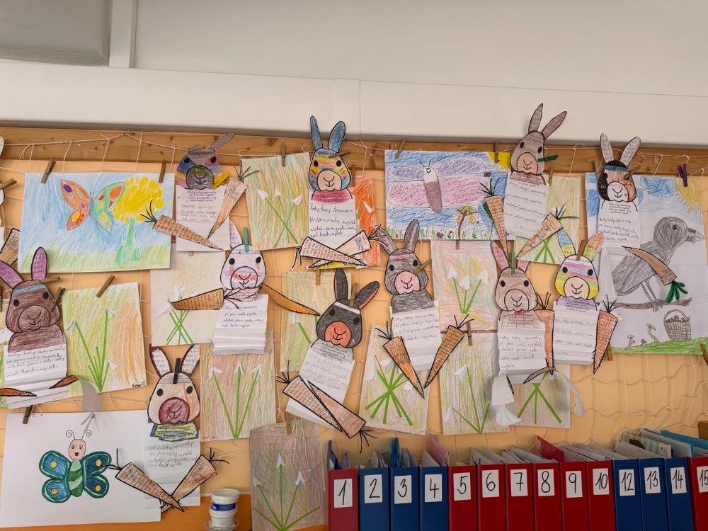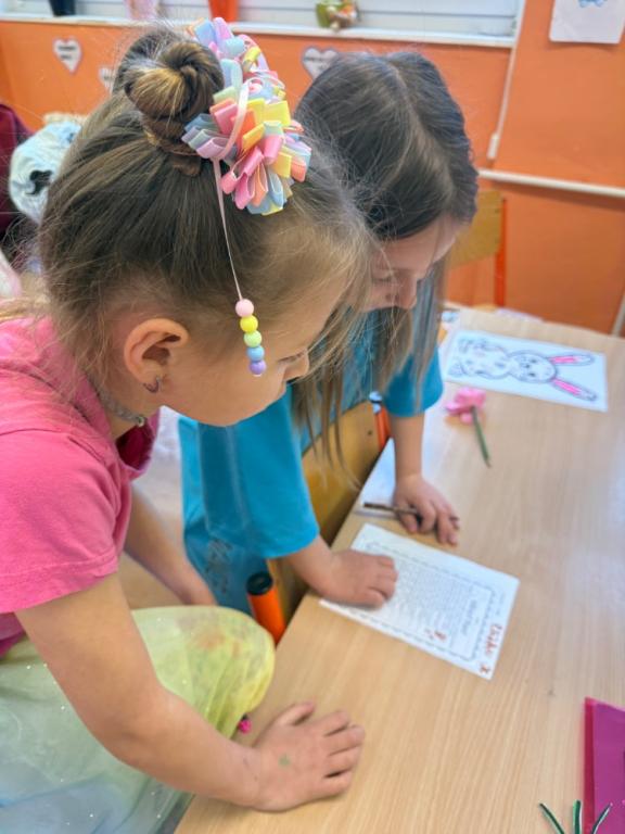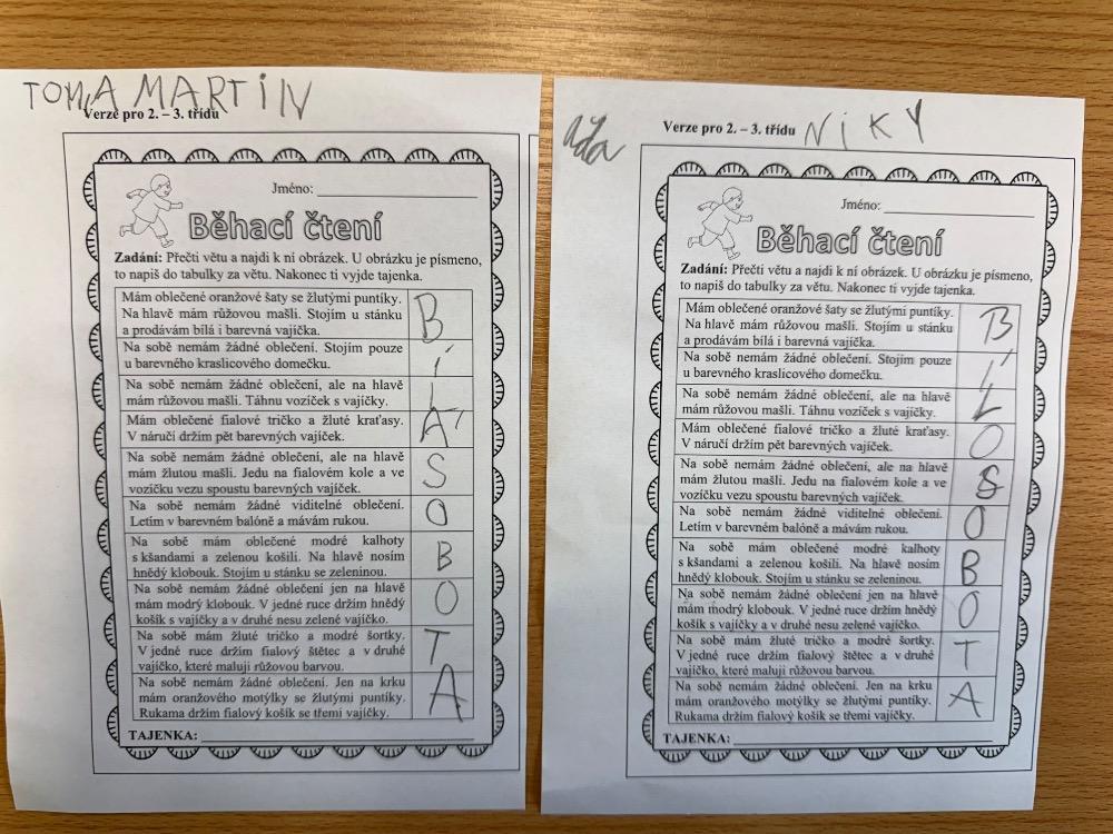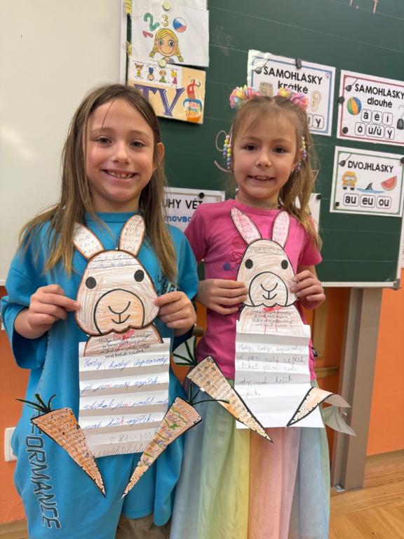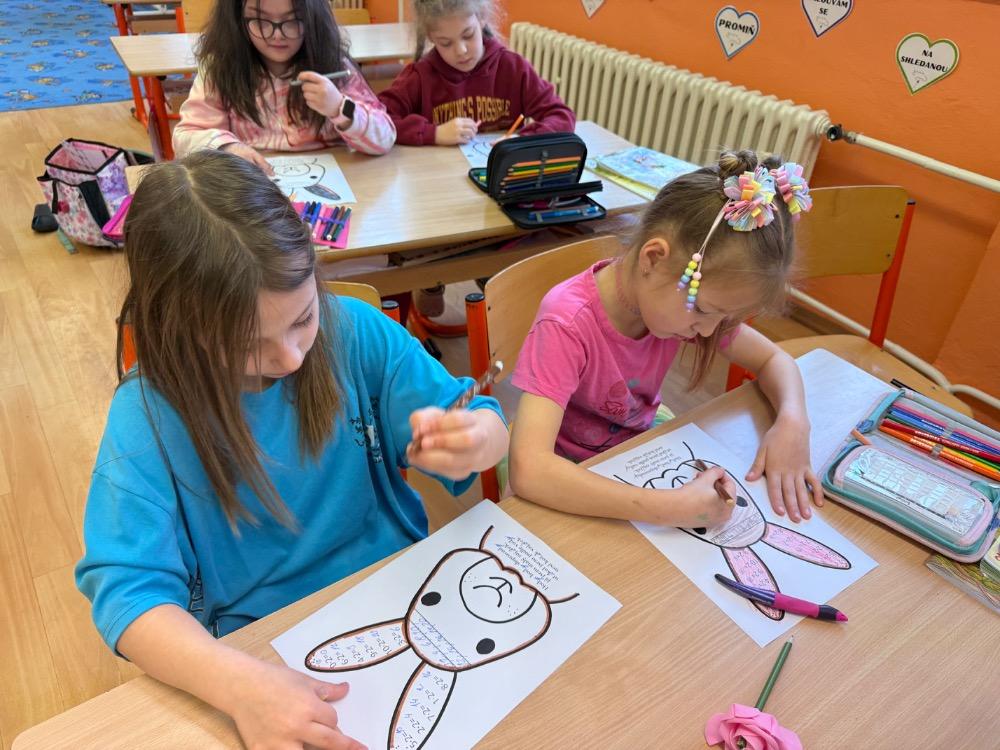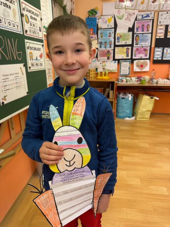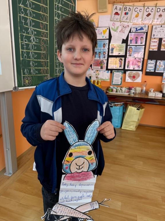 Poté jsme se pustili do tvoření. Při výrobě velikonočního zajíčka a kohouta si děti hravou formou zopakovaly učivo z českého jazyka i matematiky. Nechyběla ani oblíbená aktivita – běhací diktát, který děti velmi baví a při kterém si procvičují nejen pravopis, ale i spolupráci a pohyb.