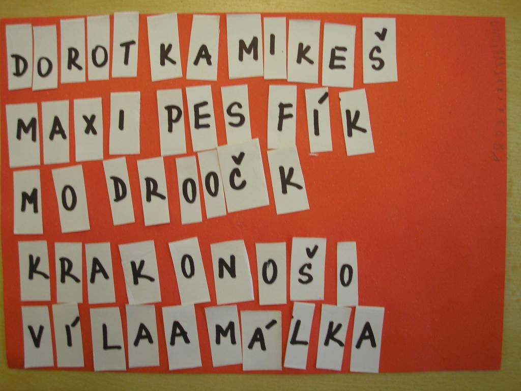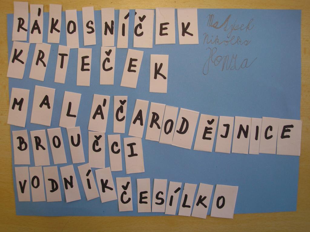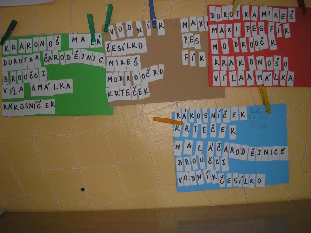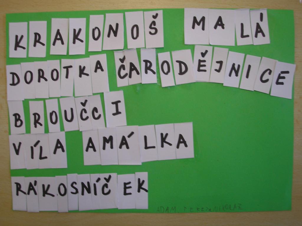 V další části hodiny jsme byli rozděleni do malých skupin. Od paní učitelky jsme obrželi balíčky, ve kterém byly rozstříhané písmenka. Z písmenek jsme měli složit a uhádnout pohádkovou bytost.