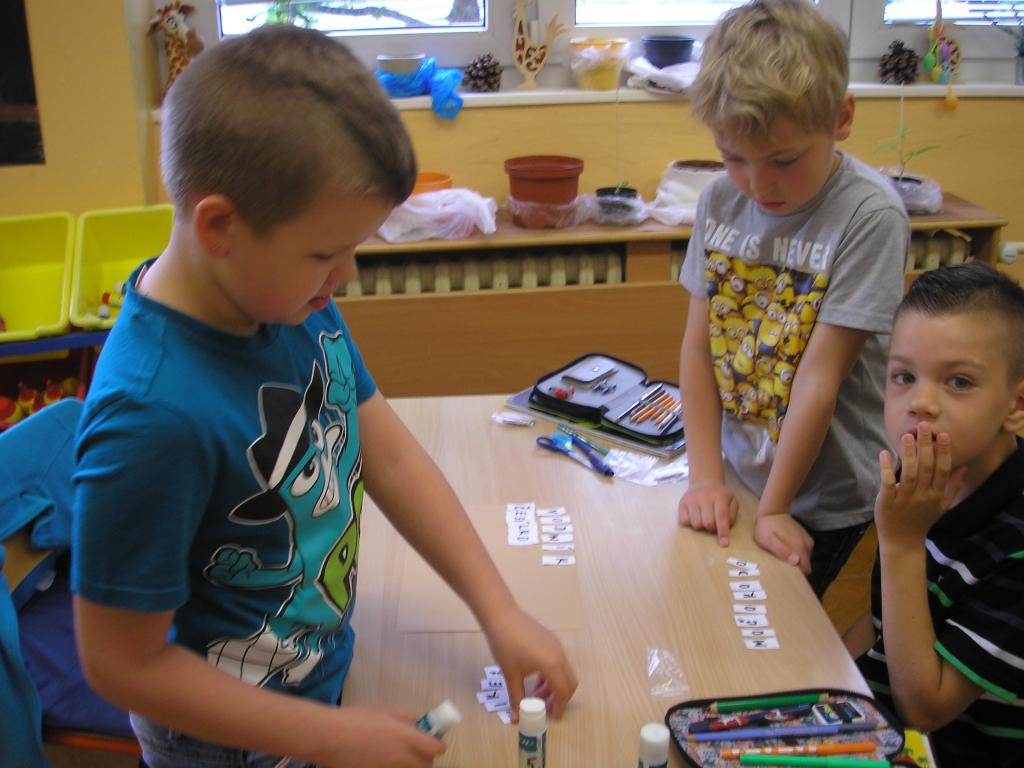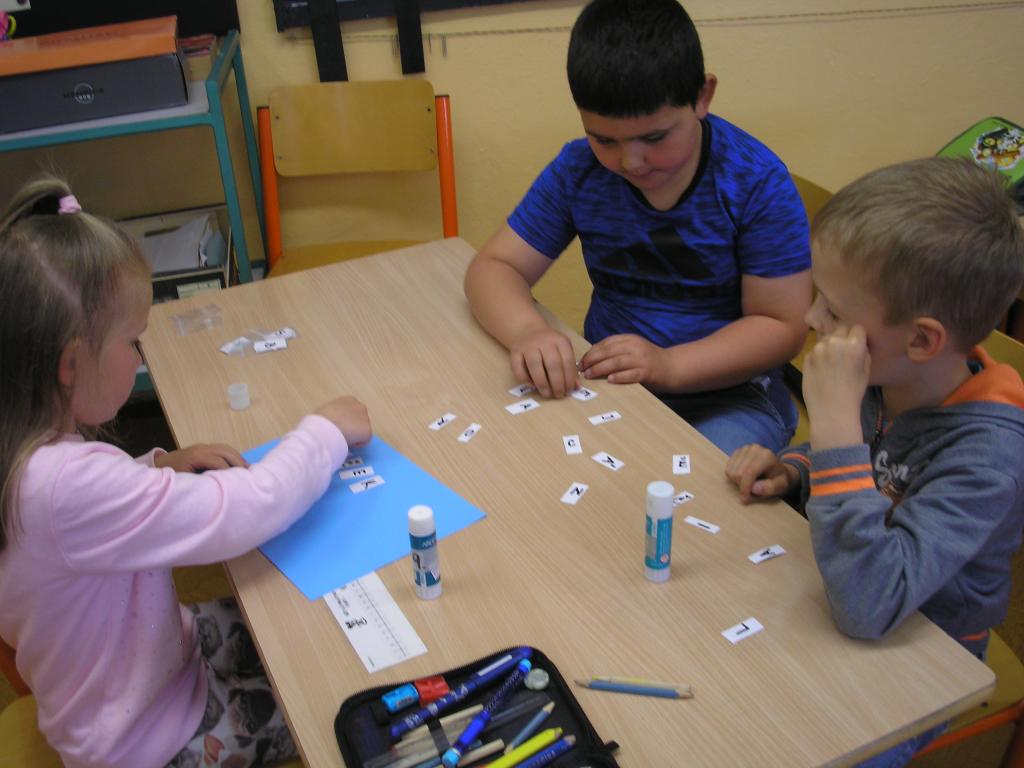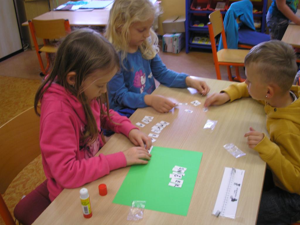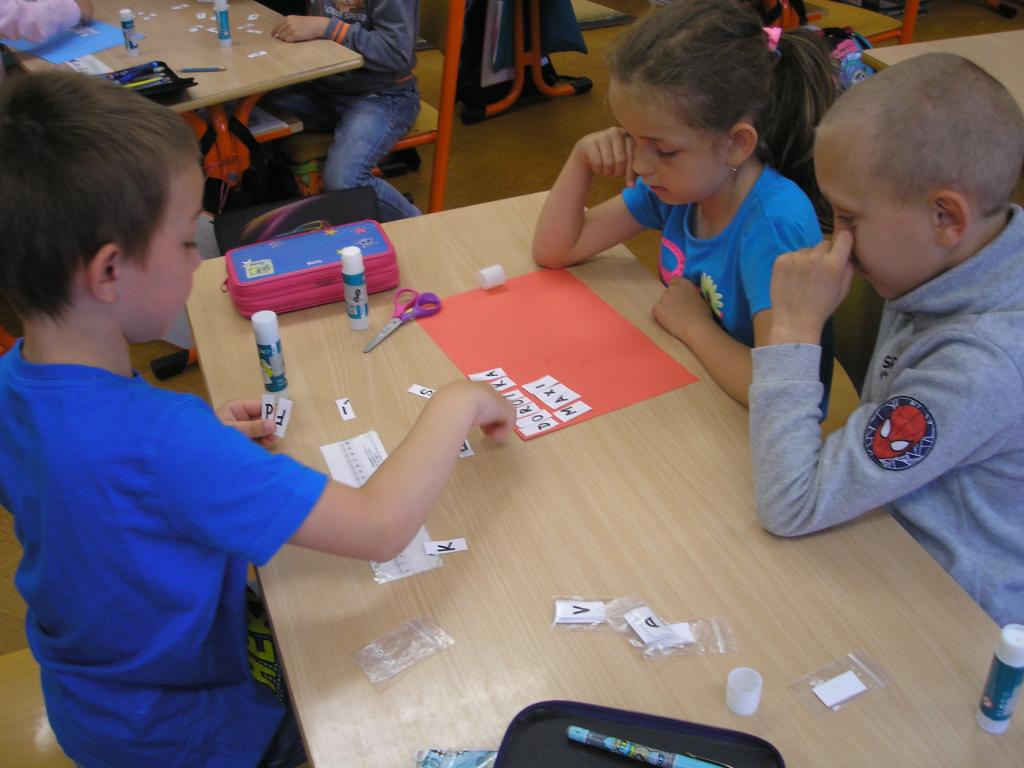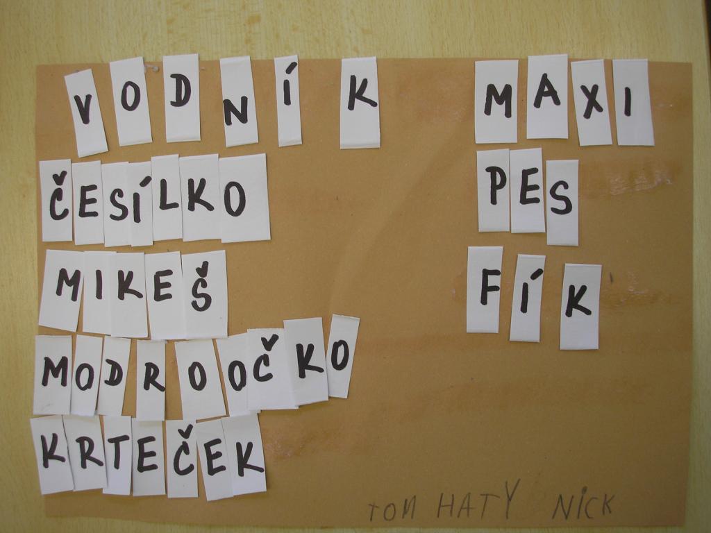 V další části hodiny jsme byli rozděleni do malých skupin. Od paní učitelky jsme obrželi balíčky, ve kterém byly rozstříhané písmenka. Z písmenek jsme měli složit a uhádnout pohádkovou bytost.