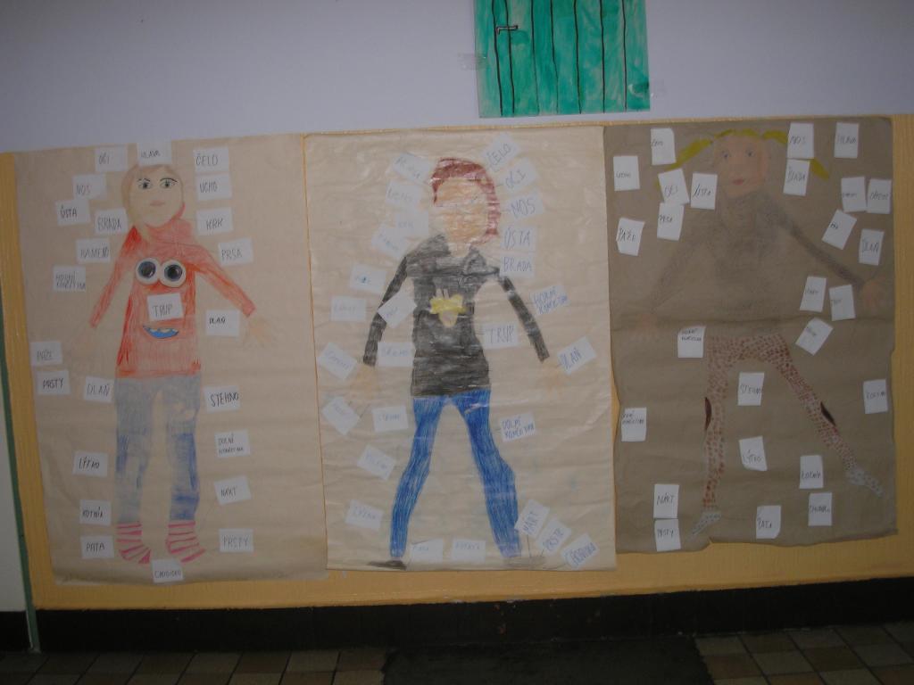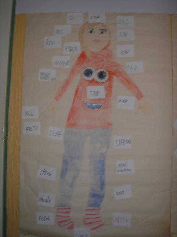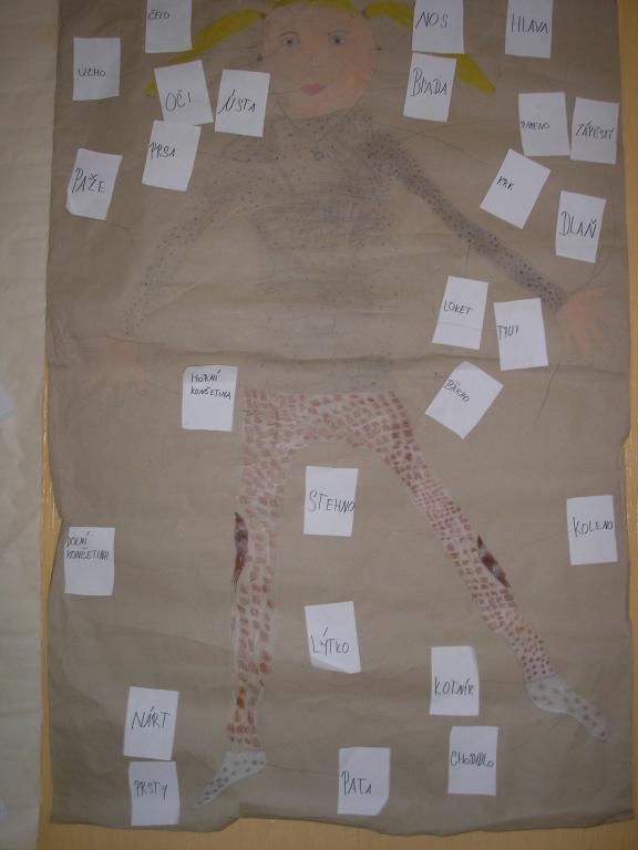 V hodinách prvouky jsme se zbývali tématem "Člověk a zdraví". Sami na sobě i na spolužákovi jsme si ukázali a popsali jednotlivé části našeho těla. Poté jsme si povídali o zdravé výživě, která přispívá ke správnému růstu kostí, svalstva a o rizicích nesprávné výživě a jejích důsledcích - obezitě. Tématem jsme zabrousili do nemocech a upevňování zdraví např. otužováním. Téma nás natolik zaujalo, že jsme si ve skupinách vytvořili svého "člověka". Něktěří z nás se stali modelem, kterého jsme obkreslili a poté dotyčného (dotyčnou) ztotožnili s kresbou. Modelky dohlížely, zda se samy poznávají.