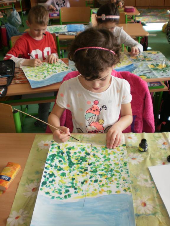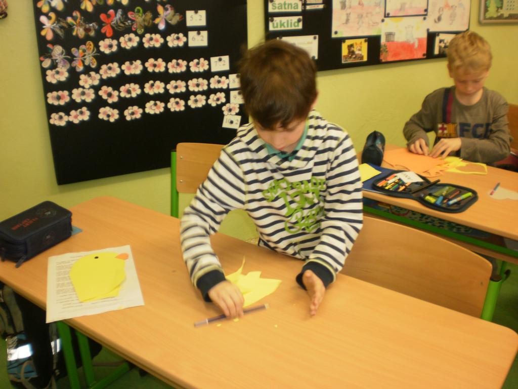 Uvítali jsme jaro přednesem několika básní. Vyhledávali jsme rýmy, počítali sloky a verše, kreslili jsme ilustrace. Báseň, která nás zaujala, jsme přednášeli zpaměti. Jarní témata nás provází všemi vyučovacími předměty. Četli jsme několik příběhů. Zazpívali jsme si několik písní s jarní tematikou a zahráli krátkou scénku. Namalovali jsme jarní krajinu několika technikami. Máme teď krásně vyzdobenou šatnu veselými barvami. Při hodinách prvouky si povídáme o přírodě a jejích proměnách, o hospodářských i volně žijících zvířatech a jejich mláďatech. Při hře: „Na statku“ se nikdo nenechal napálit. V matematice řešíme slovní úlohy. A hry s počítáním? To je teprve zábava. Do projektu se zapojují všichni s nadšením.