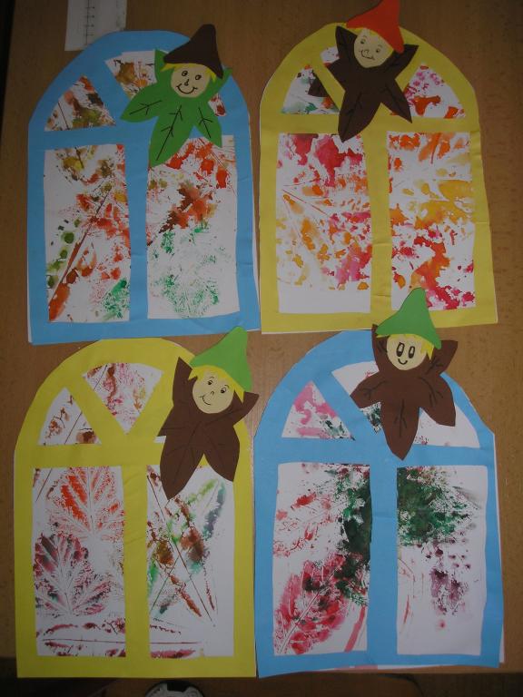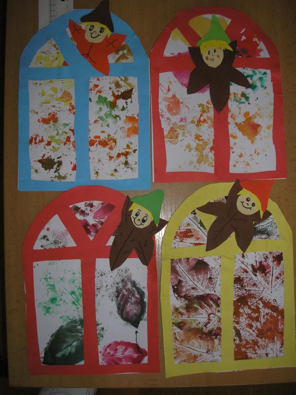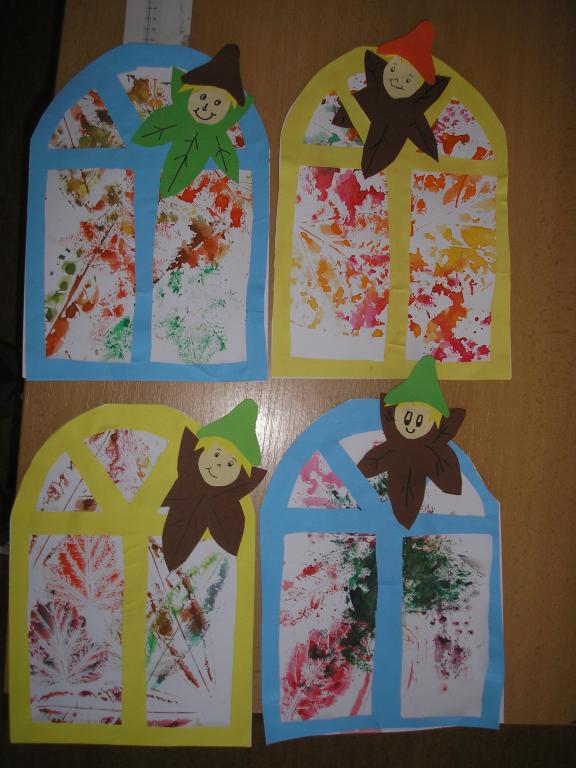 Vyzkoušeli jsme si techniku - otisky listů, dále práce s papírem, stříhání, lepení a sestavování obrázku dle slovního postupu.