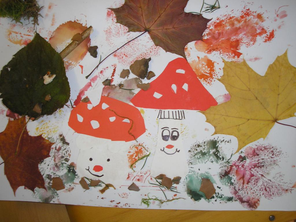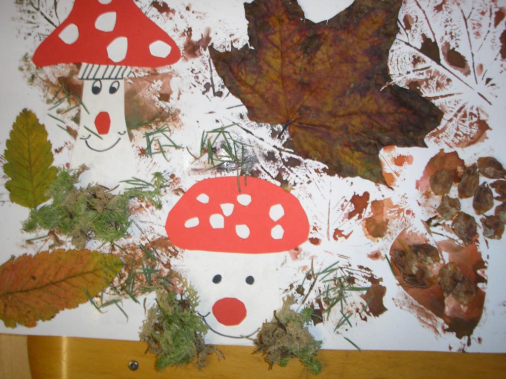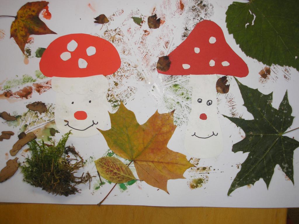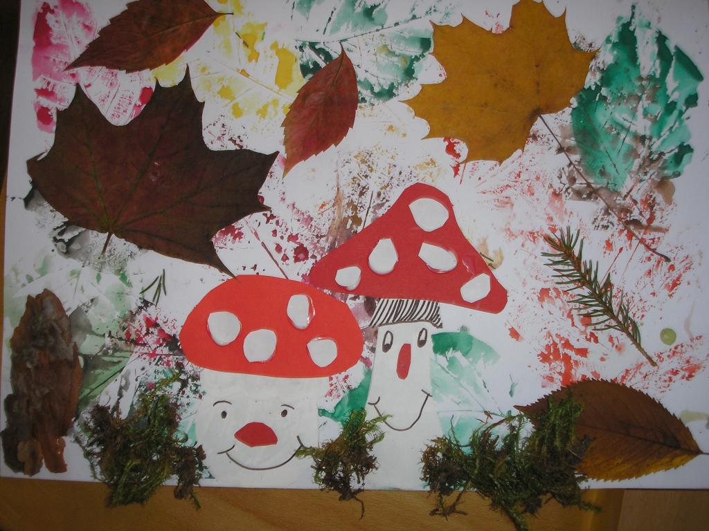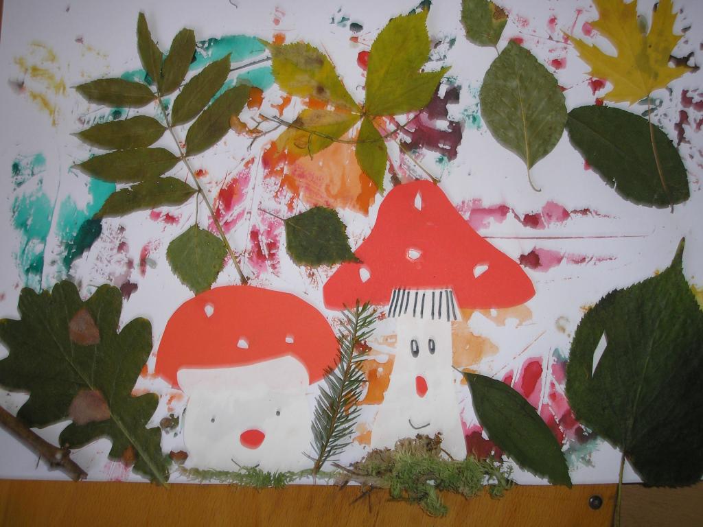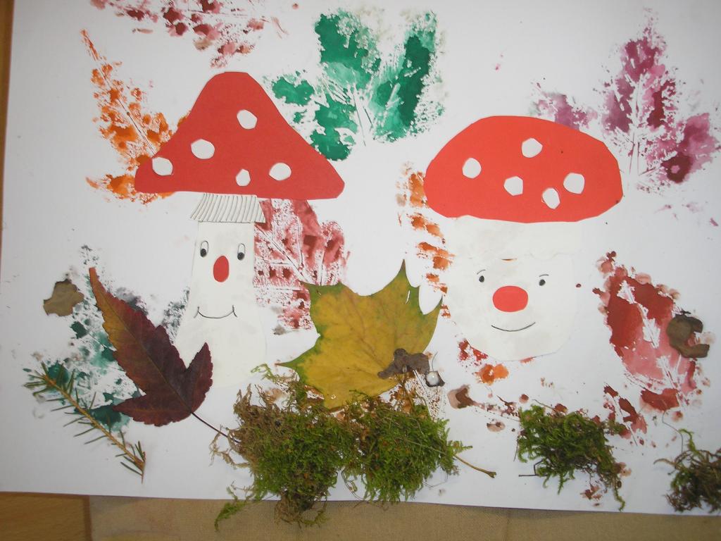 Podzimní inspiraci jsme opět využili v hodinách výtvarné výchovy. Tentokrát jsme si vytvořili koláž. Nejprve jsme otiskovali velikosti různých listů, poté jsme si dle šablony vyrobili muchomůrky červené a nakonec jsme využili přírodniny z lesa- vylisované listy, větvičky, mech, šišky apod. Tím jsme koláž dokončili.