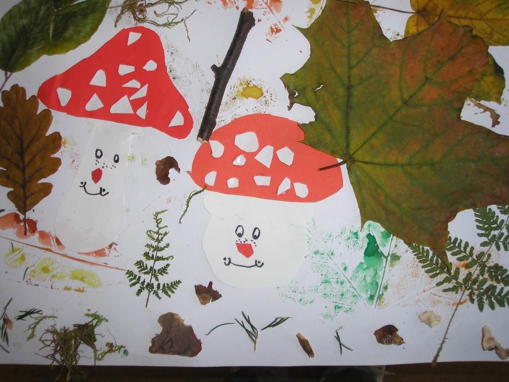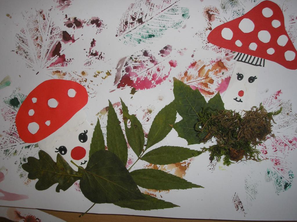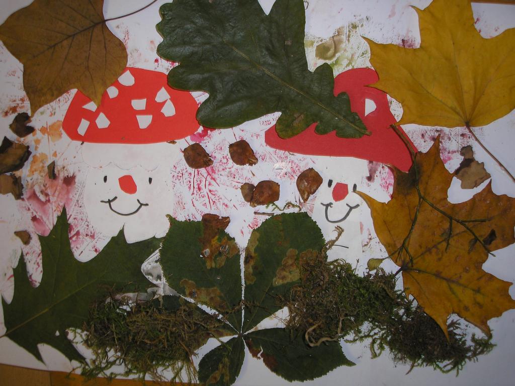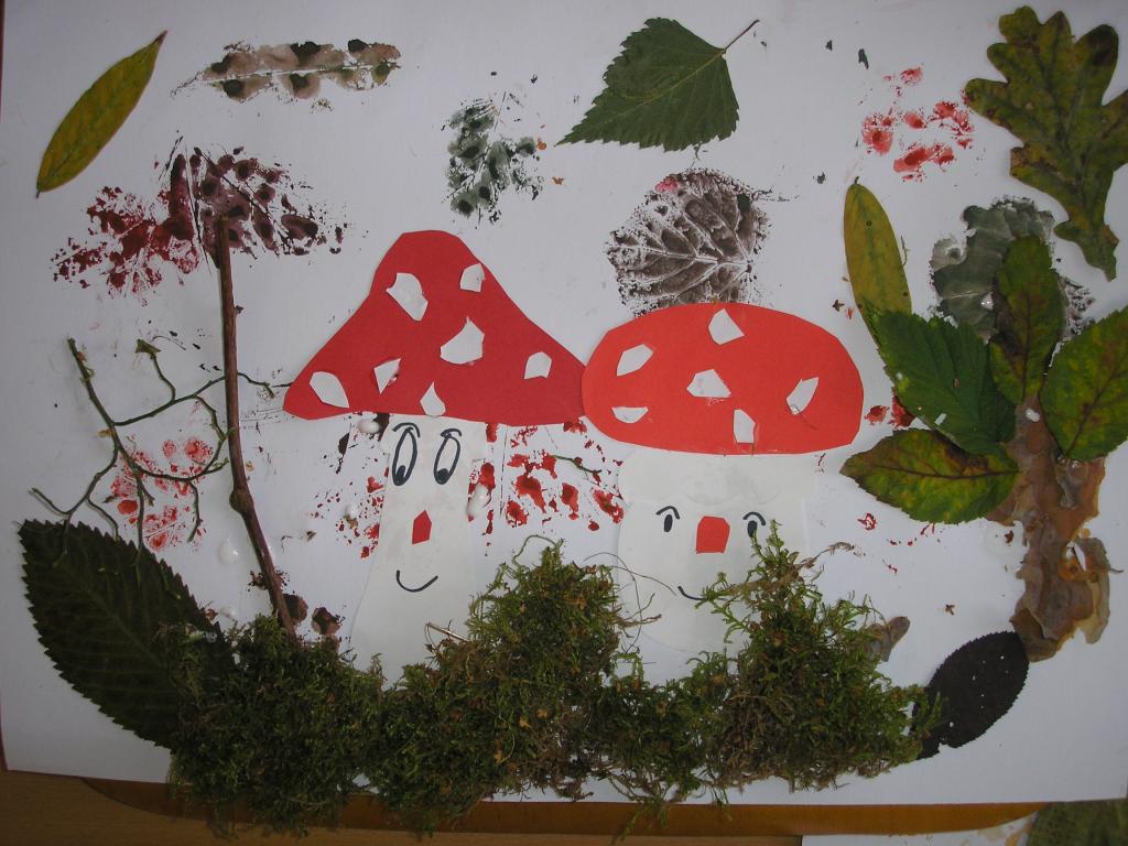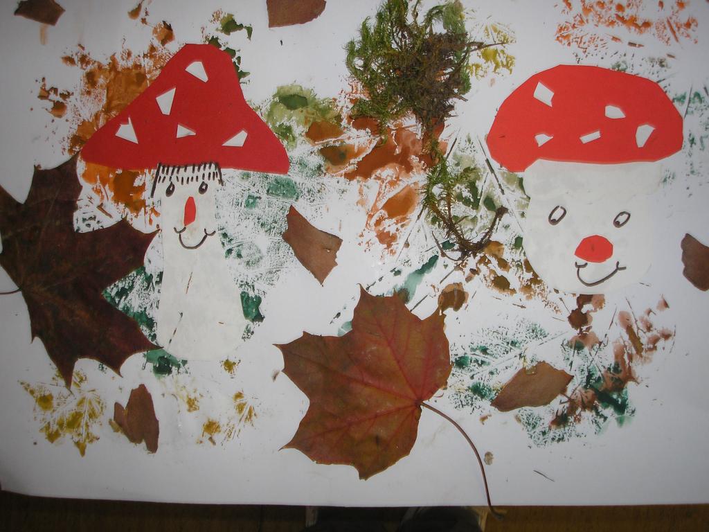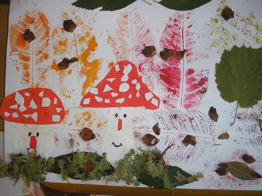 Podzimní inspiraci jsme opět využili v hodinách výtvarné výchovy. Tentokrát jsme si vytvořili koláž. Nejprve jsme otiskovali velikosti různých listů, poté jsme si dle šablony vyrobili muchomůrky červené a nakonec jsme využili přírodniny z lesa- vylisované listy, větvičky, mech, šišky apod. Tím jsme koláž dokončili.