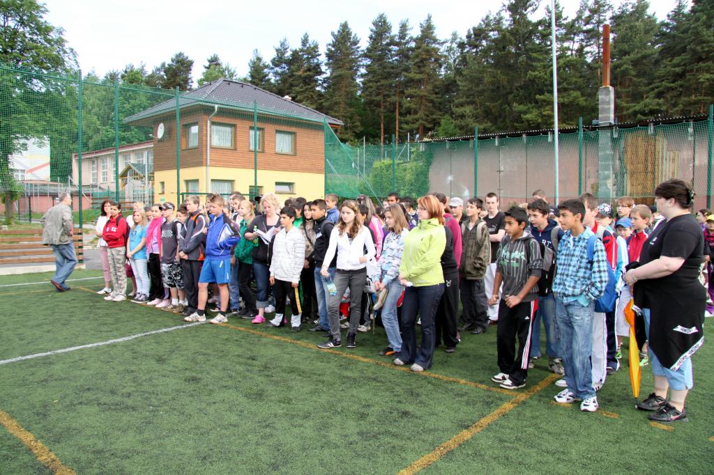 Pro žáky 6.-9. tříd to znamenalo utkat se během dopoledne v rámci paralelních tříd postupně ve vybíjené, kopané, basketbalu a volejbalu. V současnosti máme však jen jednu šestku a jednu devítku, a tak stejně jako v loni získalo naše sportovní klání mezinárodní nádech, neboť jsme našim třídám pozvali jako soupeře žáky z partnerské školy v saském Lengenfeldu. Ti však dorazili o něco později, a proto odehráli pouze tři sporty. Celé klání krátce po osmé zahájil pan starosta Zemek a pan ředitel Mgr. Riedl, kteří všem také zároveň popřáli vše nejlepší, a šlo se na věc.