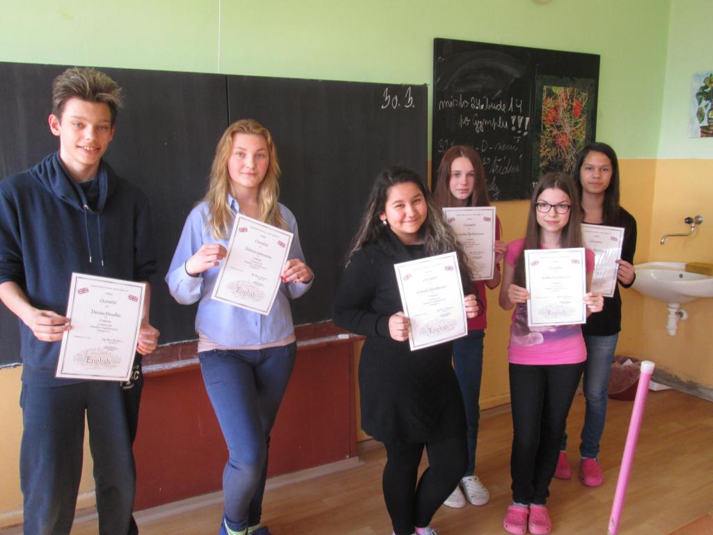 Ve čtvrtek 19.3.2015 se 18 žáků zúčastnilo olympiády v anglickém jazyce na naší škole. Pracovali ve dvou kategoriích. 6. a 7. ročníky byli v 1. kategorii a 8. a 9. ročníky v 2. kategorii. Pro výherce připravil pan ředitel Mgr. Václav Riedl drobné dárky a pozornosti. Ocenění dostali také na památku hezký diplom.
