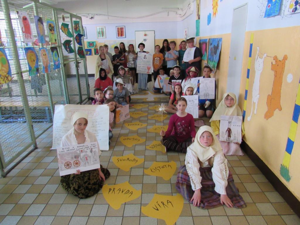 Aktuálním tématem jsme se zabývali i v hodinách vlastivědy, které jsme pojali ve formě projektu. Žáci zjišťovali informace ohledně dětství, vzdělání, myšlenky kázání, úmrtí Jana Husa. Společně jsme vytvořili myšlenkovou mapu a v závěru projektu si žáci vyzkoušeli svoji paměť – sdělovali, co si vše o Janu Husovi zapamatovali, dozvěděli a vše zapsali. V hodinách čtení si žáci vyzkoušeli dramatizaci upálení Jana Husa, kde se v Kostnici snažil obhájit své učení a které mu bylo nakonec odepřeno.