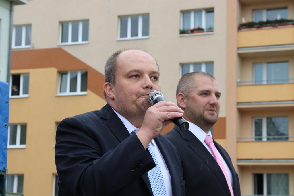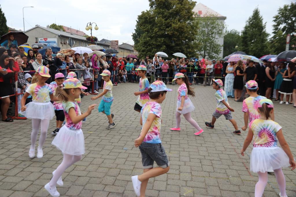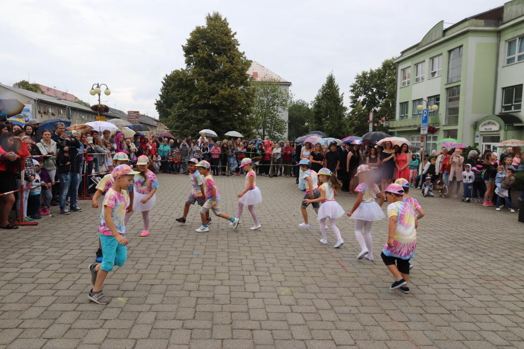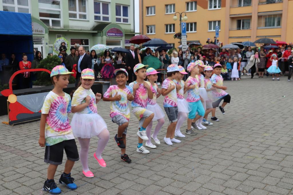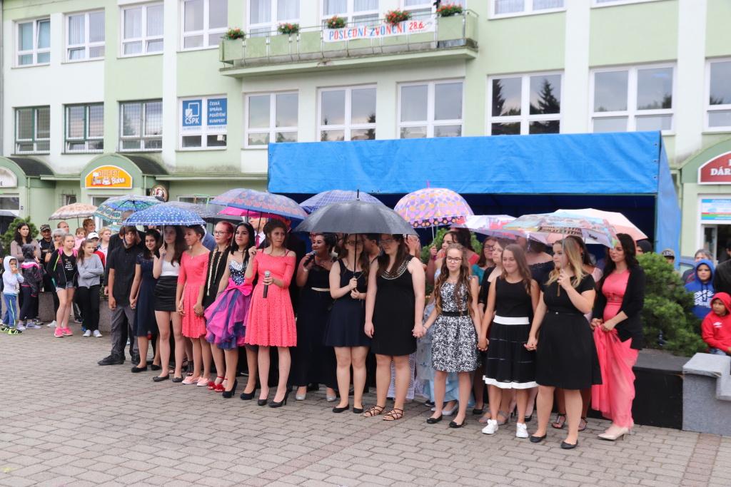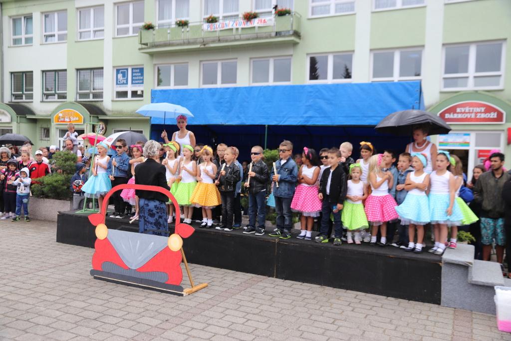 Jak je dnes již zřejmé a nad slunce jasnější i ony vychvalované aplikace se však mohou mýlit. Téměř ve stejném okamžiku, kdy od nedalekého kulturního střediska dorazil na náměstí průvod téměř devadesáti deváťáků a dětí školkou povinných, začalo drobně mrholit a postupně intenzita kapek vody zesílila až na solidní letní deštík. Když připočteme teplotu okolo osmnácti stupňů a zesílený vítr, není divu, že obzvláště šestiletým špuntům začalo být chladno. Nesli to ale statečně a s humorem a suchými svršky v této situaci vypomohli i přítomní rodiče. Vše ti vykulení mrňousové zvládali až nečekaně skvěle.