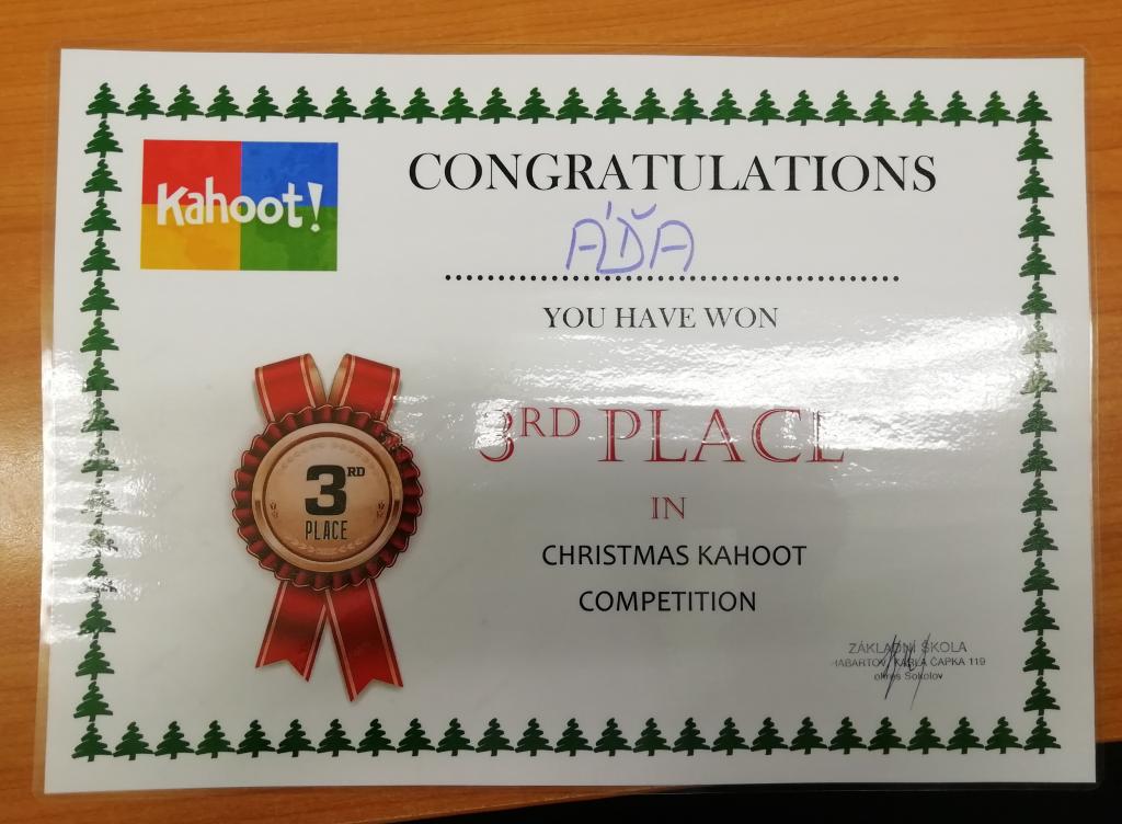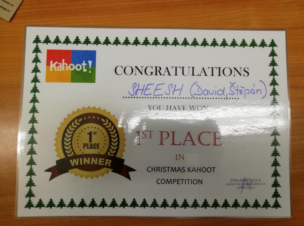 Během prosince proběhly dva turnaje s aplikací KAHOOT, kde můžete sestavit jakýkoli typ kvízu a zpestřit tím například výuku. První turnaj nazvaný „ŠŤASTNÉ A VESELÉ S KAHOOTEM“ byl vytvořen pro učitele a asistenty pedagoga naší základní školy. Druhý turnaj nazvaný „MERRY CHRISTMAS WITH KAHOOT“ pak pro žáky 6. a 7. ročníku. Tento kvíz probíhal v angličtině.