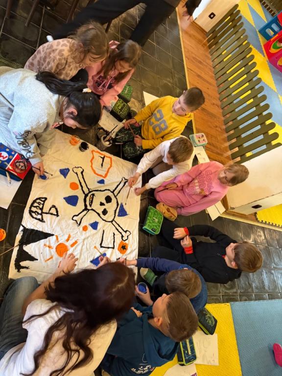 Letošním celotýdenním tématem jsou piráti, a proto byly děti rozděleny do dvou týmů, které spolu budou po celý týden soutěžit v různých hrách a aktivitách. Prvním úkolem bylo vytvořit vlastní pirátskou vlajku, vymyslet název týmu a zvolit kapitána. Děti se tohoto úkolu zhostily s velkým nadšením a kreativitou.