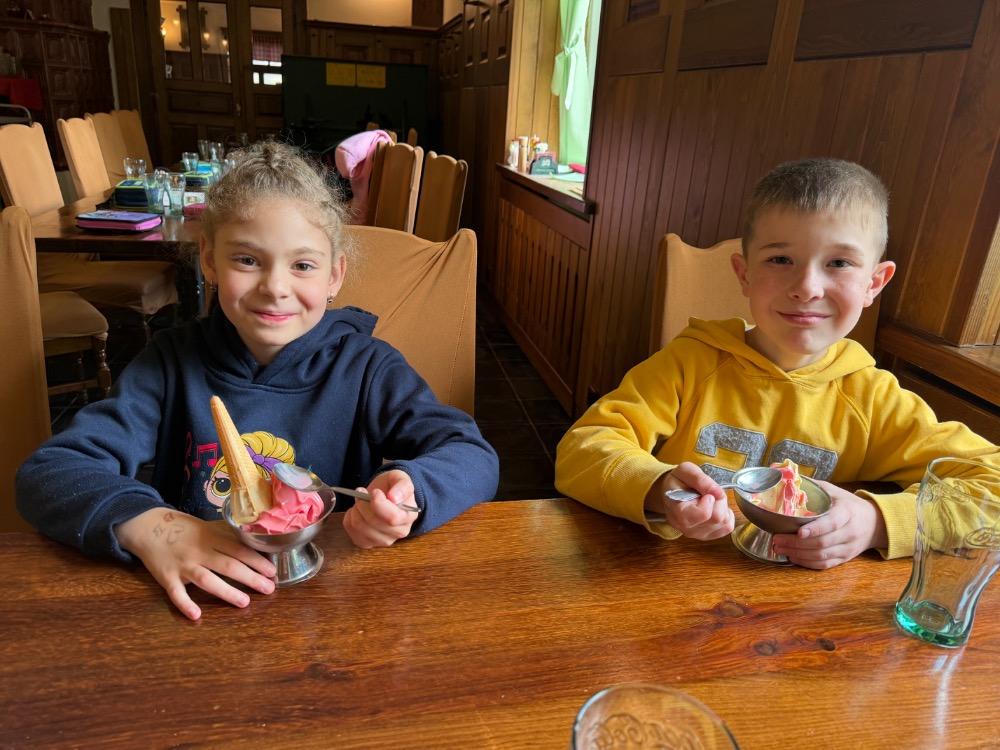 Po obědě následoval odpolední klid. Za dodržení pravidel dostaly děti za odměnu točenou zmrzlinu. Odpoledne jsme strávili na dětském hřišti. Počasí nám ale připravilo pravé aprílové překvapení, a tak jsme se při dešti přesunuli dovnitř. Tam se děti rozdělily do dvou týmů – jeden luštil zajímavý rébus psaný hlaholicí, zatímco druhý tým vyráběl vor ze dřeva.