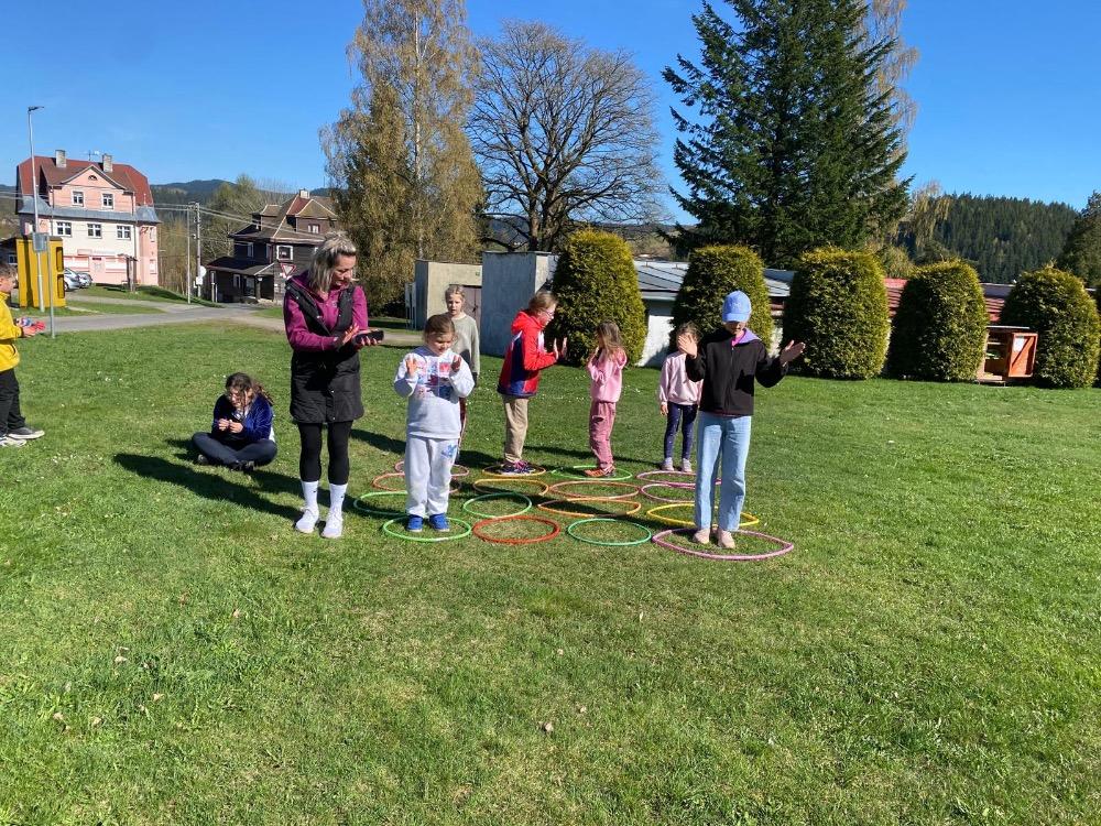 Třetí den naší školy v přírodě byl opět plný zážitků, pohybu i dobrodružství. Hned po snídani jsme se všichni vydali na dlouhou procházku do Kraslic. Během cesty děti pokračovaly ve své pirátské misi a hledaly přísady do léčivé masti pro raněné piráty.