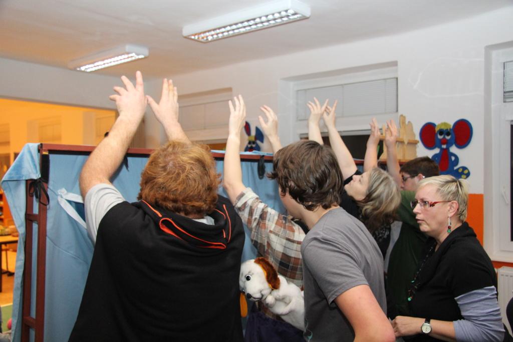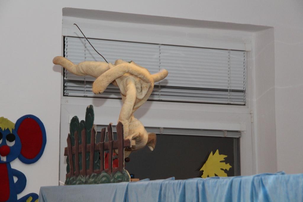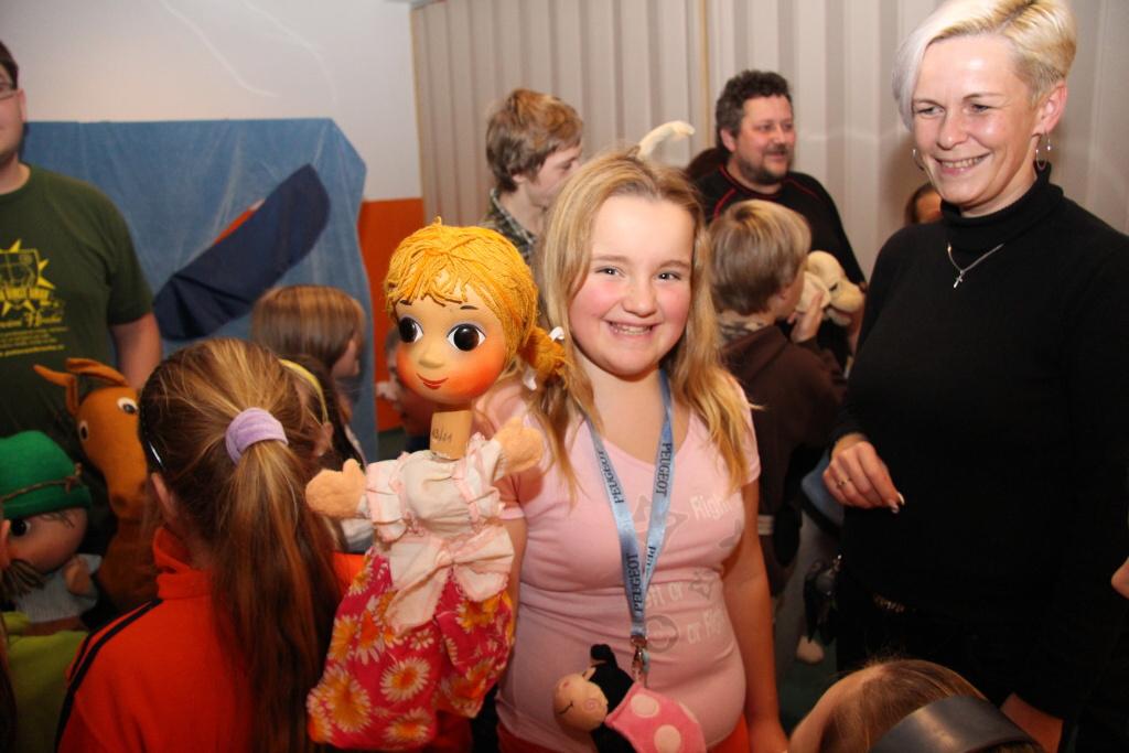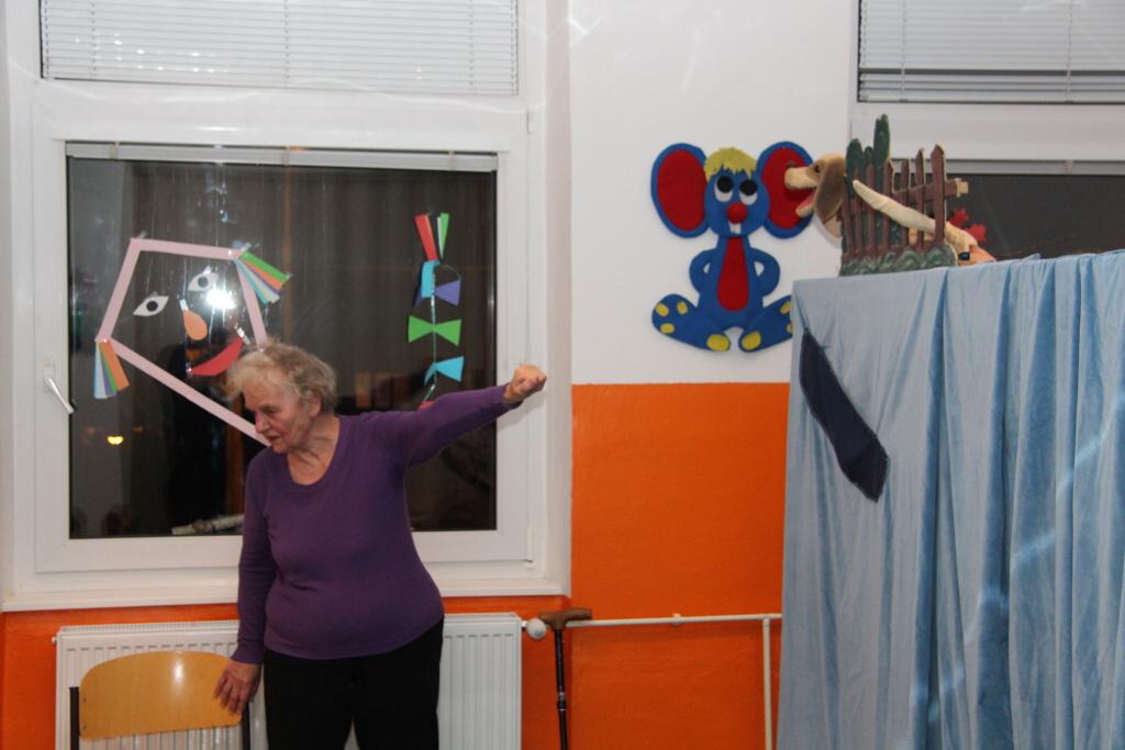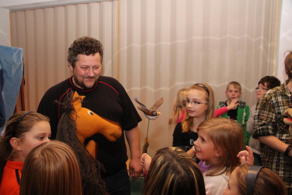 Oficiální část tím byla v podstatě ukončena, přesto oba pánové ještě několik desítek minut s mrňousy v nové herně zůstali. Na scénu totiž vstoupilo místní loutkové divadélko Kahánek, které si pro děti připravilo několik hudebních hádanek. Celý program uváděla paní Miloslava Sčotková, dlouholetá principálka a dobrá duše loutkového ansámblu. Svým neotřelým způsobem si děti hnedle získala a ty se pak předháněly v tom, kdo písničku předváděnou prostřednictvím maňásků uhodne. Samozřejmostí pak bylo, že všechny uhodnuté písničky si děti i za doprovodu hudebních nástrojů zazpívaly. V závěru vystoupení došlo i na detailní prohlídku loutek, jejichž ovládání si caparti mohli i vyzkoušet.