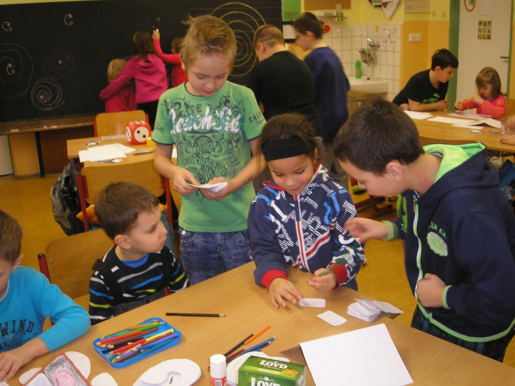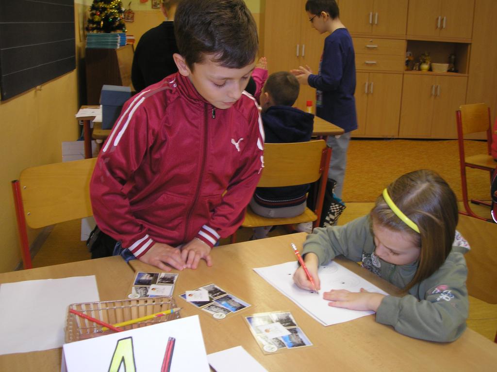Každý žák ze IV.B měl na starosti předškoláka, kterého provázel tzv. kolečkem. Společnými silami prováděli dané úkoly – učili se básničku Perníková chaloupka, vyráběli perníčky, kočičku, motali klubíčkem – psali na tabuli i na pracovní list, házeli kostkou a určovali počet teček, pojmenovávali obrázky a vytleskávali slabiky. Na závěr v kruhu jsme společně zhodnotili výsledky naší práce. Děti z MŠ nám řekly, co se jim nejvíce líbilo na „kolečku“. Žáci IV.B naopak zhodnotili své žáčky. Na úplný závěr jsme si s dětmi řekli básničku Perníková chaloupka.