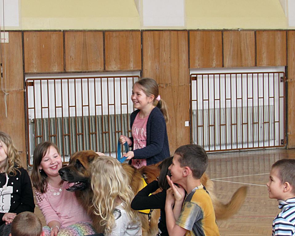 Děti byly nadšené – besedu o tom, jak se k psům chovat, jak se snažit pochopit jejich myšlení, jak se vyvarovat chybám vedoucím k napadení člověka psem sledovaly takřka bez dechu. Během chvilky se s obrovskými nádhernými leonbergery Kájou a Jarouškem skamarádili, a kdyby mohly, každý z nich by si hned aspoň jednoho z nich odvedly domů…i ten největší strašpytel zjistil, že s námi v tělocvičně jsou ti nejhodnější a nejklidnější psi pod sluncem.