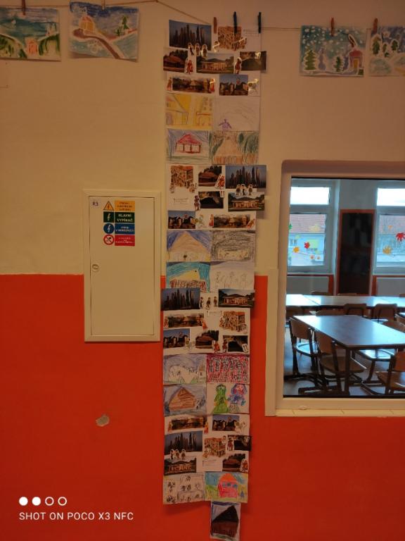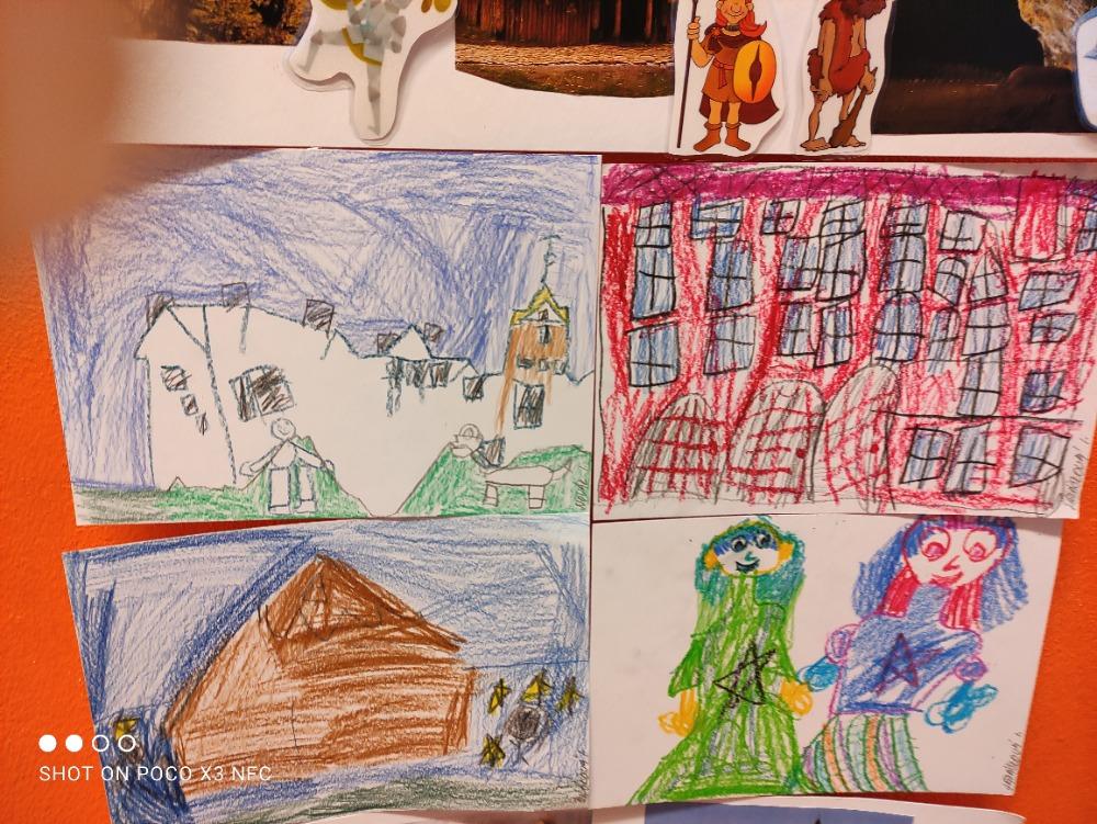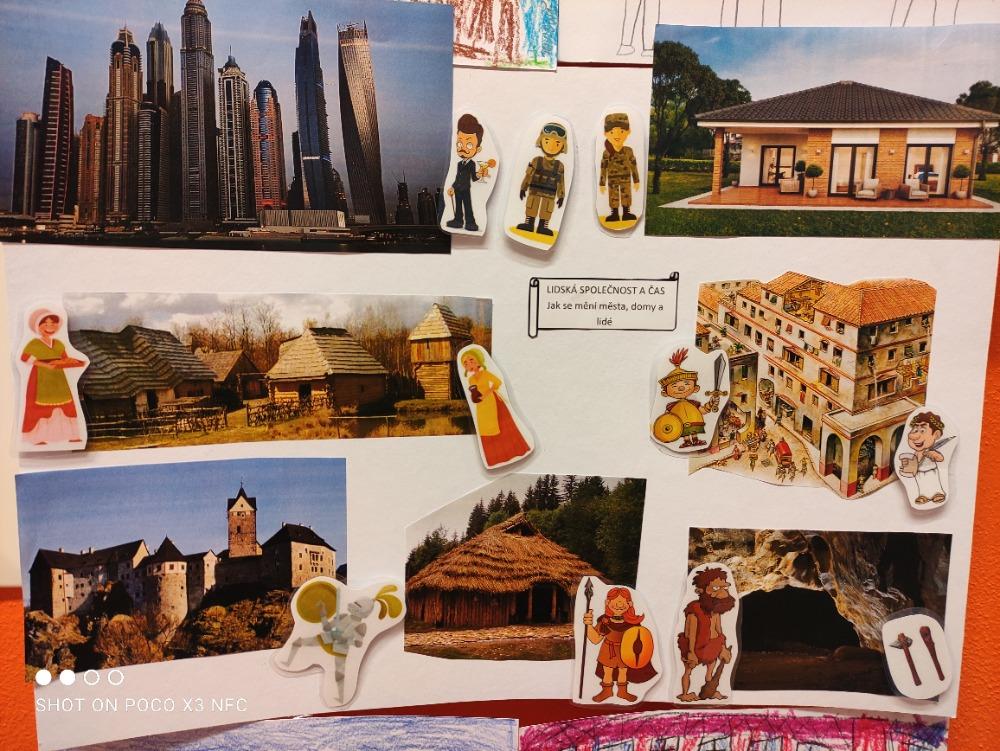 Téma lidské společnosti jsme pak pojali jako koláž obydlí a obyvatel. Úkolem bylo správné přiřazení. Děti se s tím popasovaly velice dobře.
