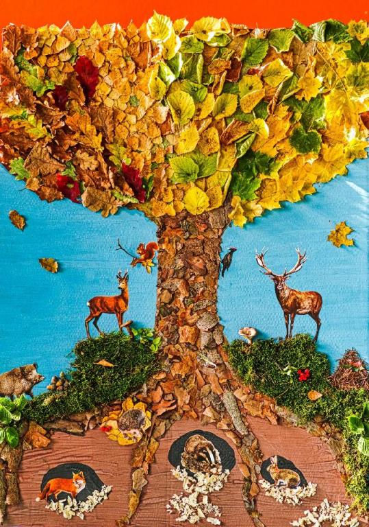 Několik ptáčků do koruny, lesní zvířátka a tvorečky hledající úkryt v samotných kořenech stromů.