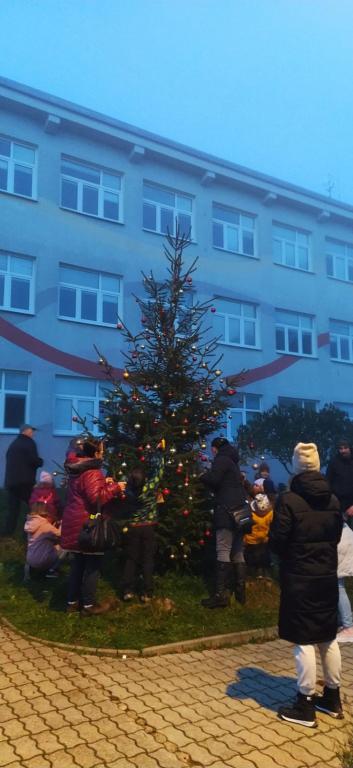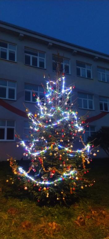 Pan školník nám letos zajistil velikánský vánoční strom a bylo jen na nás, zda jej necháme zelený, či z něj uděláme skutečný vánoční strom.