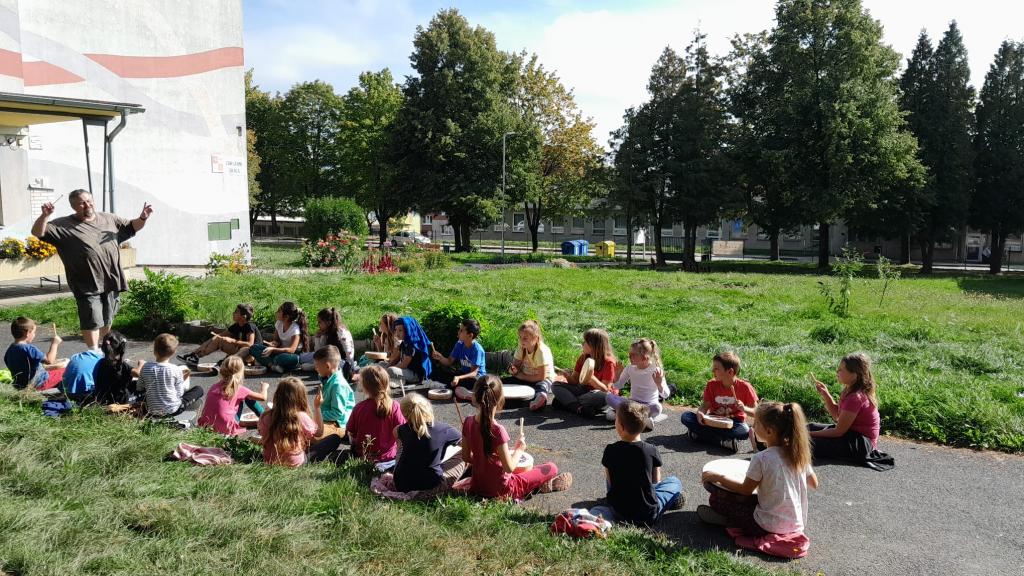 Představa o poklidném představení daného nástroje se rychle rozplynula. Pan školník pojal předvedení bubnů velice aktivně. Z dětí se v jeho podání stala rázem horda lovců mamutů.