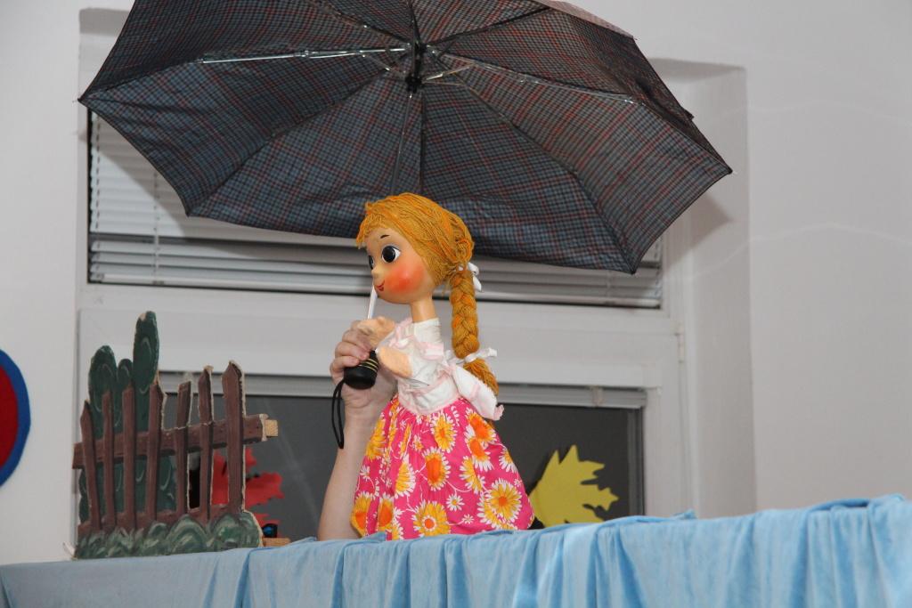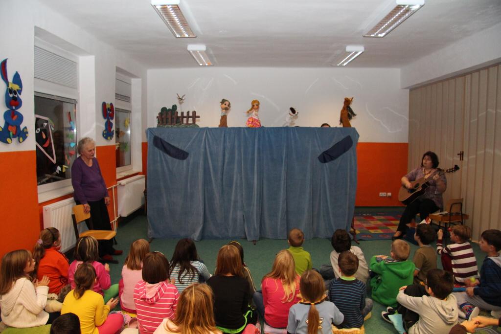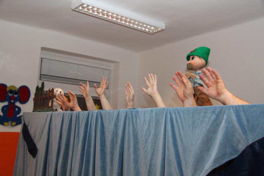 Oficiální část tím byla v podstatě ukončena, přesto oba pánové ještě několik desítek minut s mrňousy v nové herně zůstali. Na scénu totiž vstoupilo místní loutkové divadélko Kahánek, které si pro děti připravilo několik hudebních hádanek. Celý program uváděla paní Miloslava Sčotková, dlouholetá principálka a dobrá duše loutkového ansámblu. Svým neotřelým způsobem si děti hnedle získala a ty se pak předháněly v tom, kdo písničku předváděnou prostřednictvím maňásků uhodne. Samozřejmostí pak bylo, že všechny uhodnuté písničky si děti i za doprovodu hudebních nástrojů zazpívaly. V závěru vystoupení došlo i na detailní prohlídku loutek, jejichž ovládání si caparti mohli i vyzkoušet.