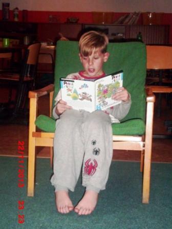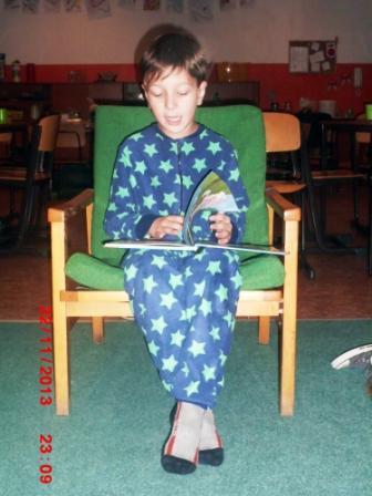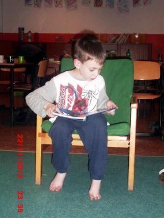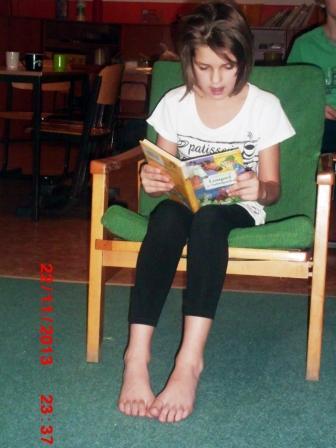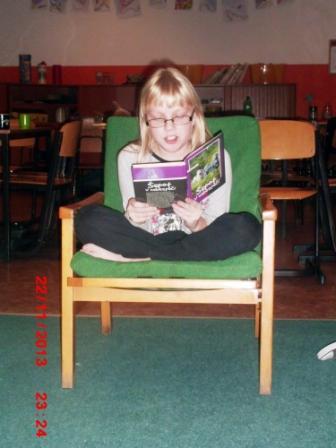 Při soutěži vyhládlo a tak po vyhlášení vítězů přišla na řadu „druhá večeře“. Pak už vybalování spacáků, převlékání do pyžam a nočních košilek, ukládání se…ale pozor – ne k spánku. Připravené křeslo pozvalo každého, kdo chtěl číst a vyprávět ostatním o své oblíbené knížce. Sešly se knížky dobrodružné, naučné, pohádkové, tajemné i hodně veselé. Každý se snažil a ostatní naslouchali…a jako když čte maminka na dobrou noc…někteří usnuli…