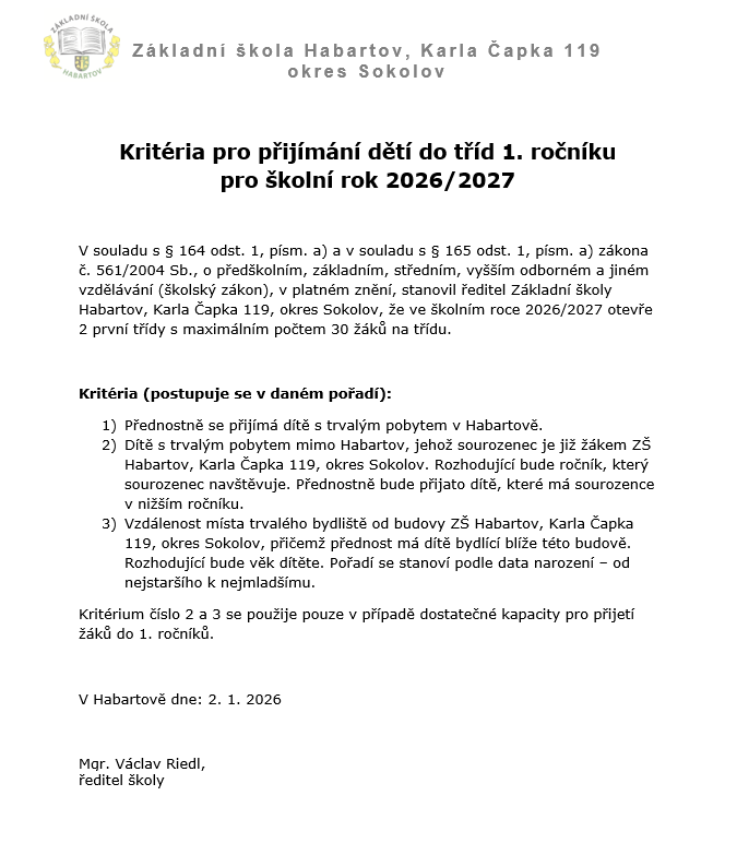 Kritéria pro přijímání dětí do tříd 1. ročníku pro školní rok 2026/2027