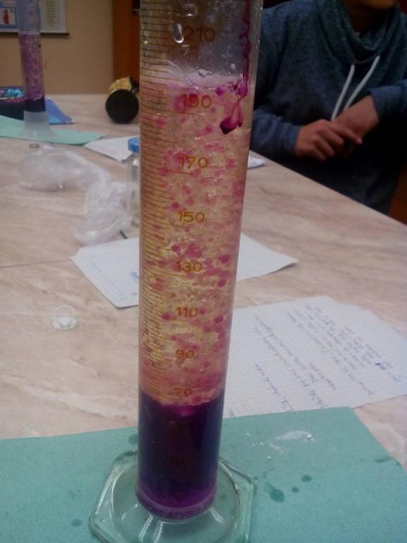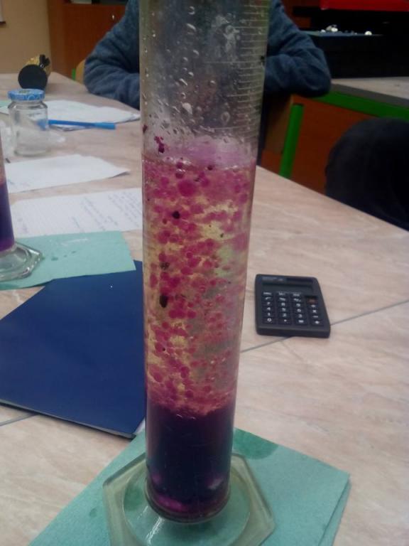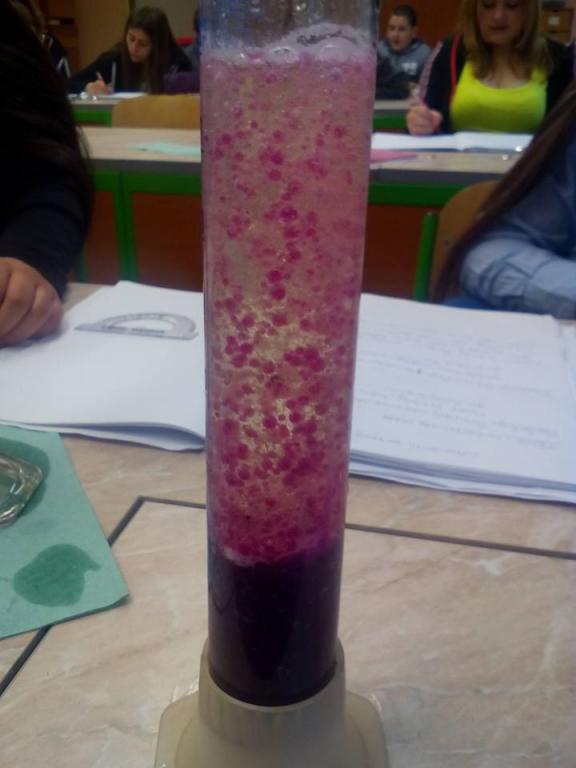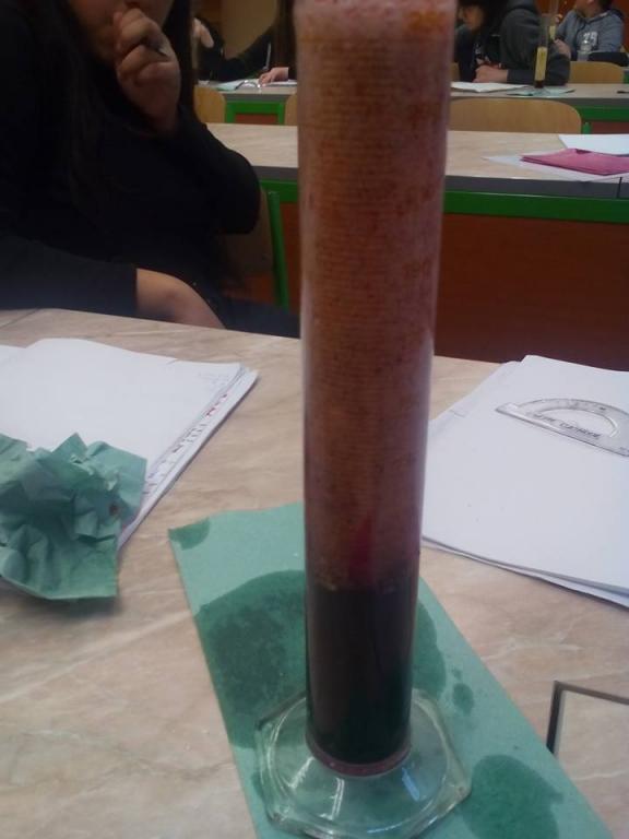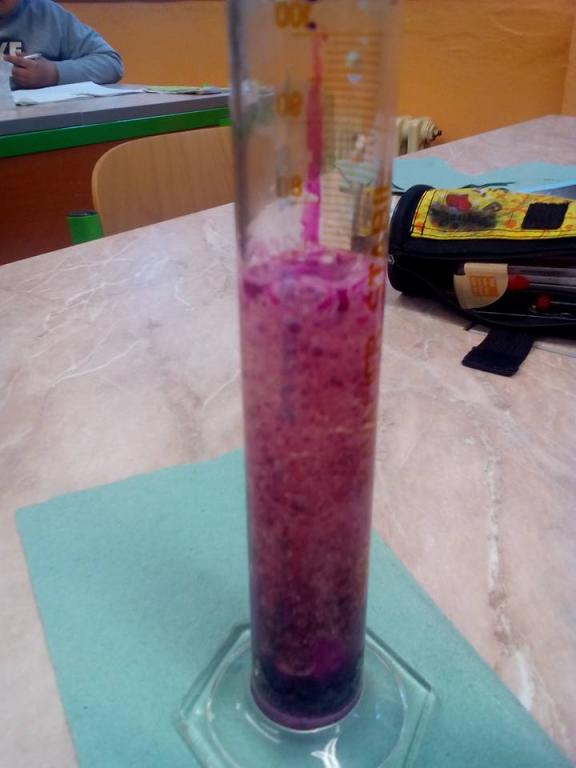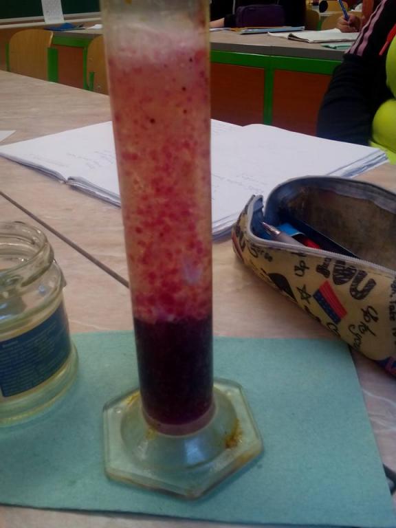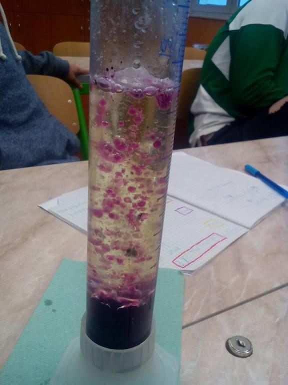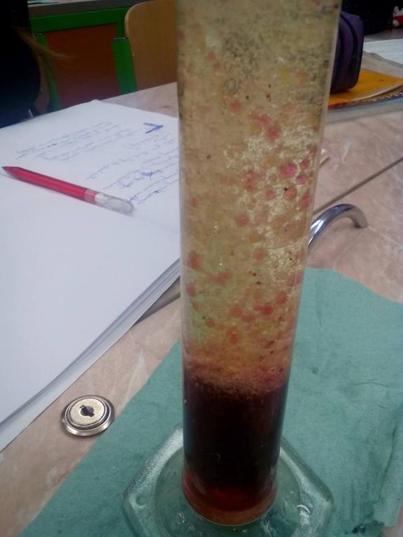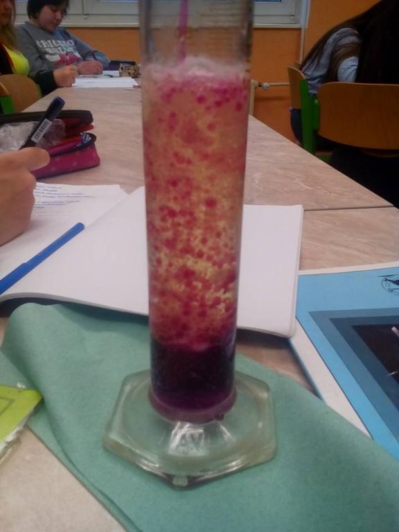 V květnu jsme v hodinách chemie opět experimentovali a vyzkoušeli jsme si vlastnosti různých kapalin za určitých podmínek... Tentokrát jsme se zaměřili na vodu, olej, obarvenou vodu a použili jsme jeden šumivý celaskon (oxid uhličitý). Žákům se velice líbil efekt tohoto pokusu.
