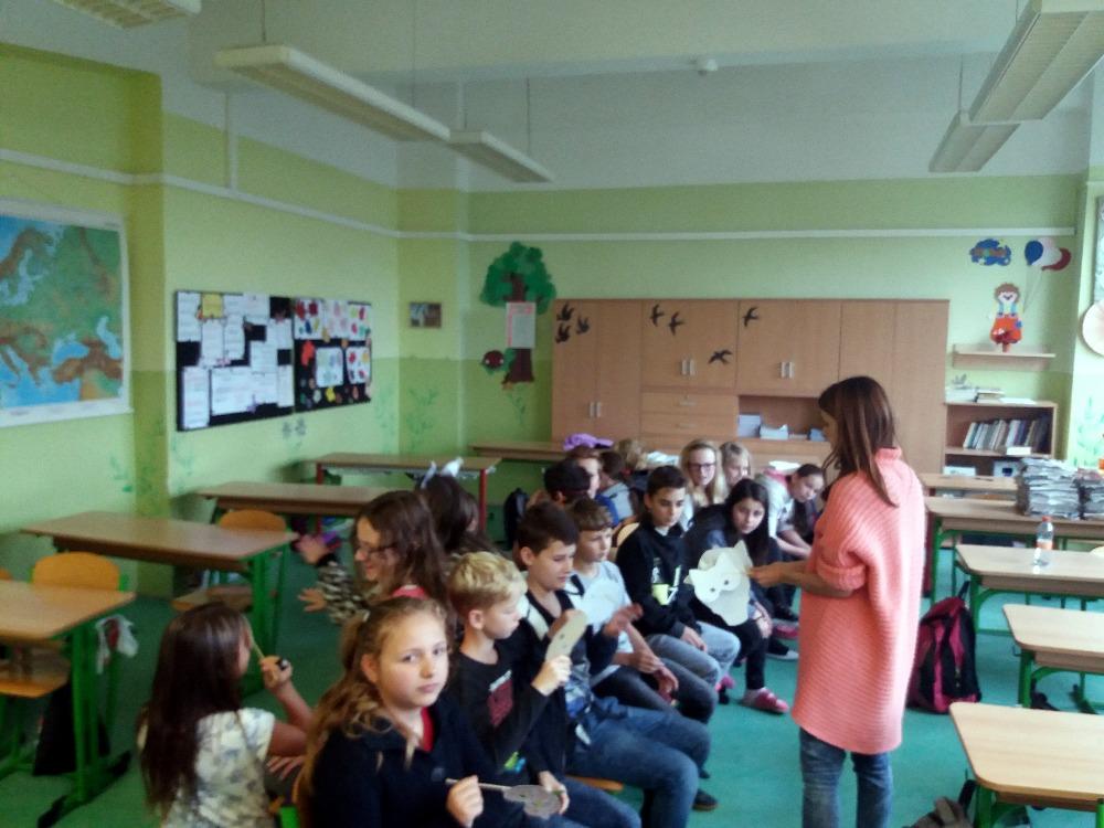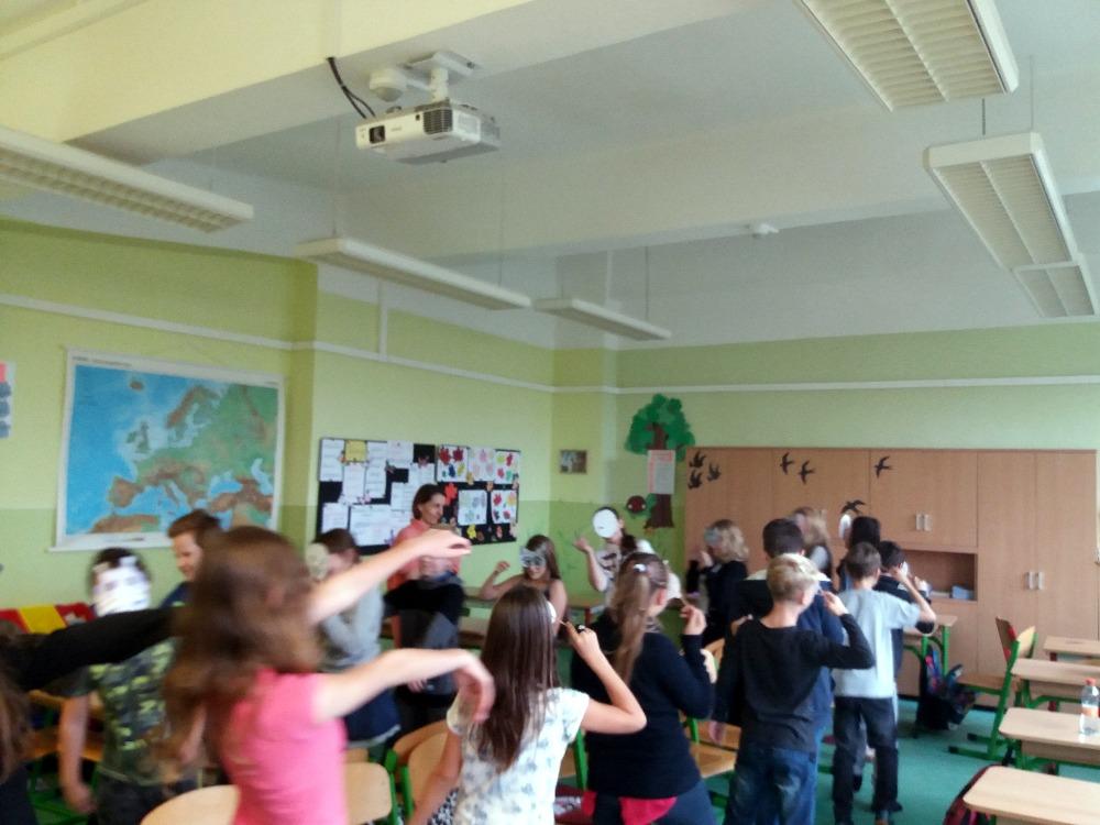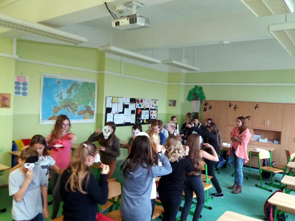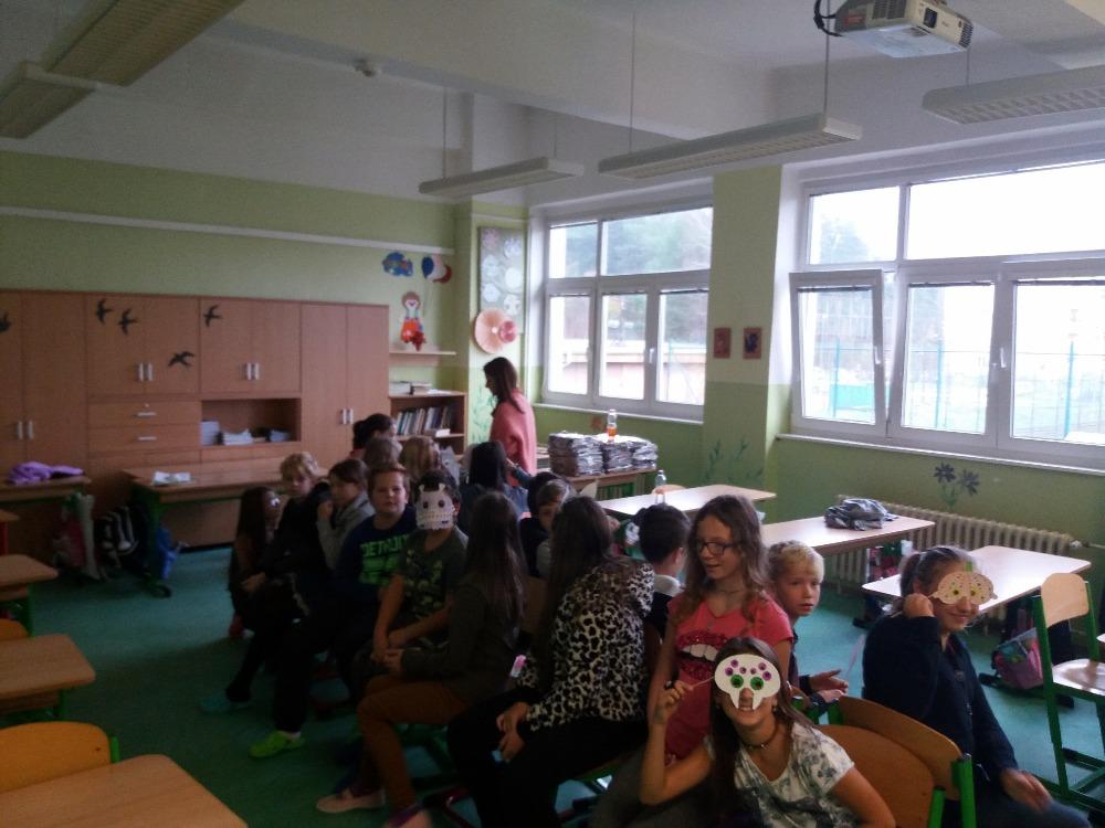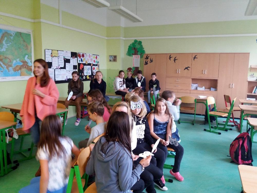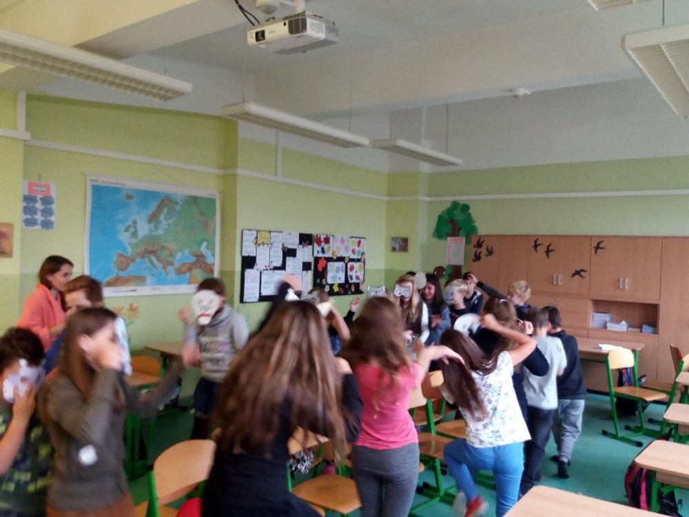 Na začátku další vyučovací hodiny jsme s paní učitelkou pomohli žákům dodělat masky. Mezitím si děti zahrály další soutěž – Bingo. Čímž si zopakovali novou slovní zásobu z minulé hodiny. Vítězové byli opět odměněni. Po dodělání masek jsme si zahráli hru „židličkovaná“.