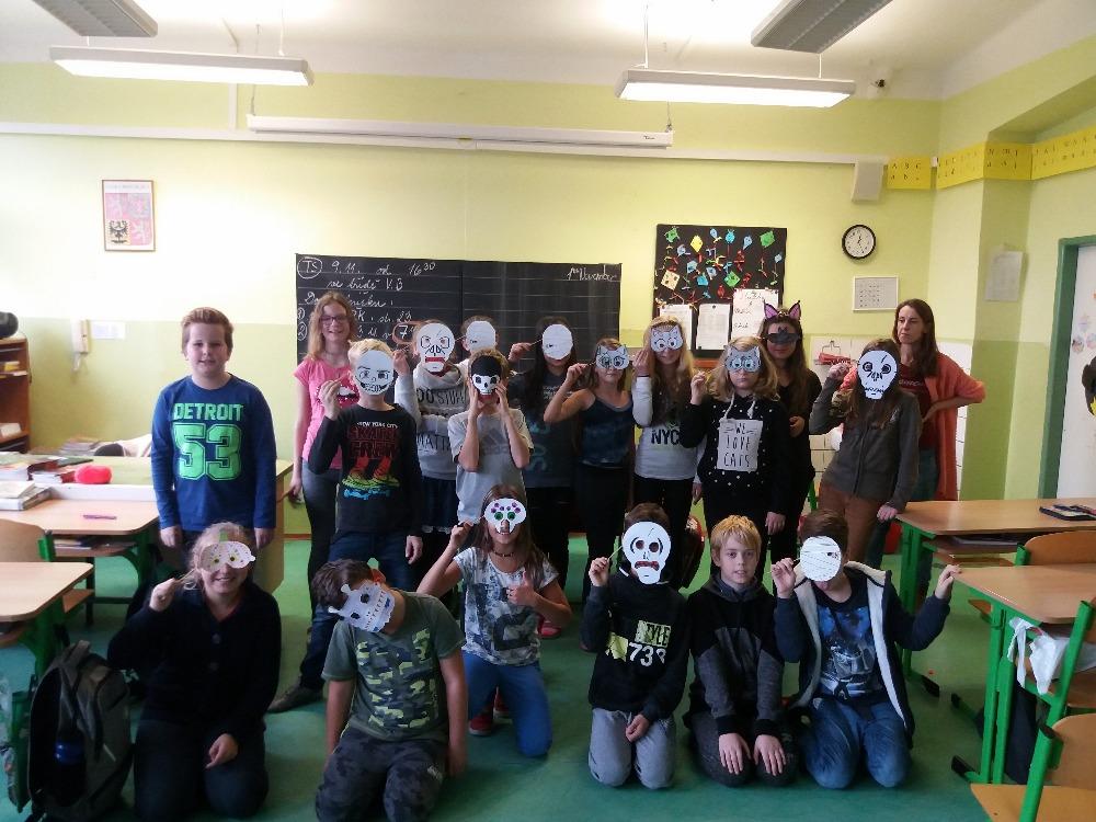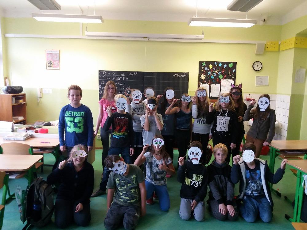 Halloween je znám i tím, že se různé věci balí do toaletního papíru. A proto naše 2. soutěž byla zabalení spolužáka do toaletního papíru. Ke konci hodiny si žáci losovali masky, které si měli za domácí úkol vybarvit a vystřihnout na další vyučovací hodinu.