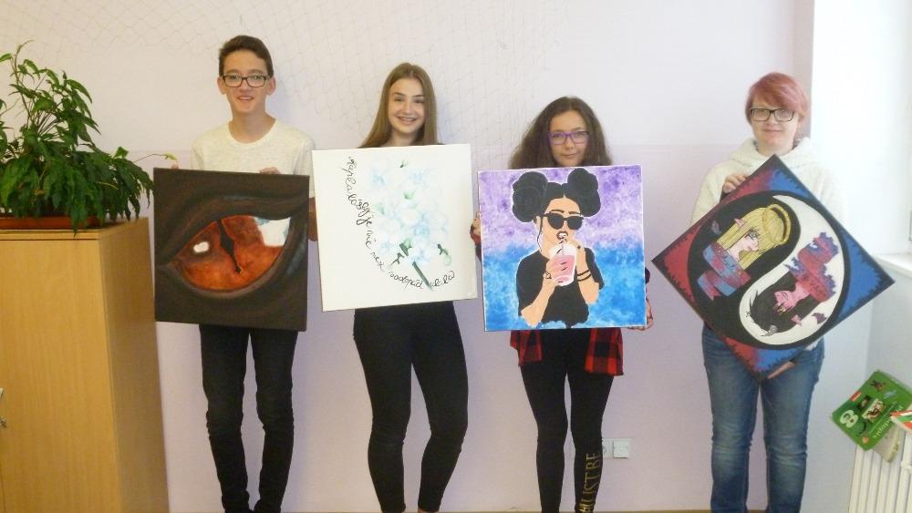 Za výrobu Vánočního fotokoutku dostali v pololetí naši výtvarníci (Eliška, Kristýna, Rosťa a Gábina) jako odměnu další malířské plátno. Na konci června nám přinesli ukázat svá díla. Můžete se podívat s námi, jak jsou šikovní.