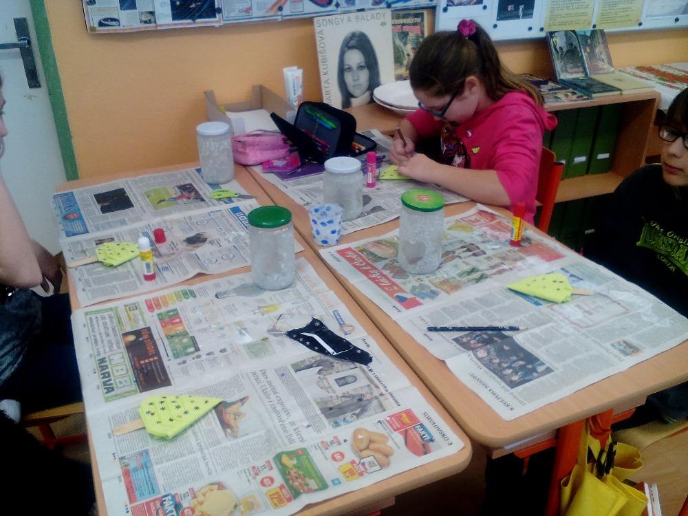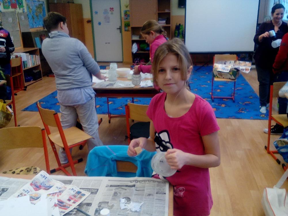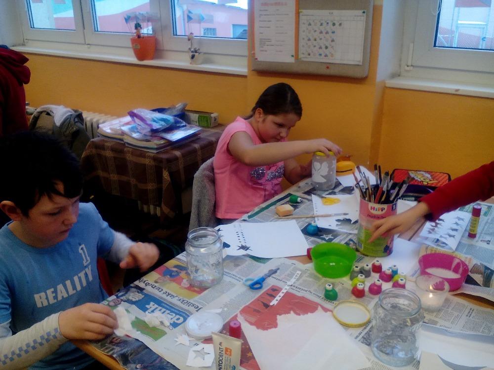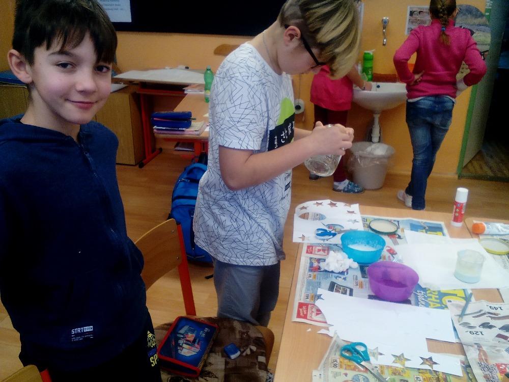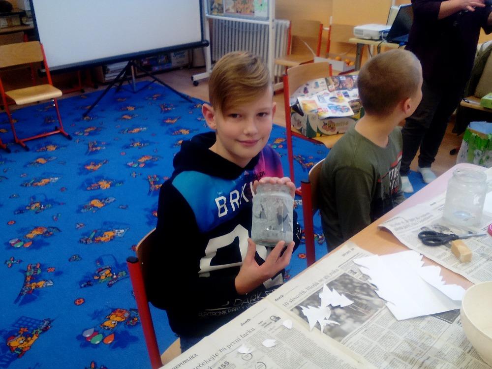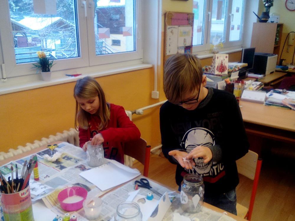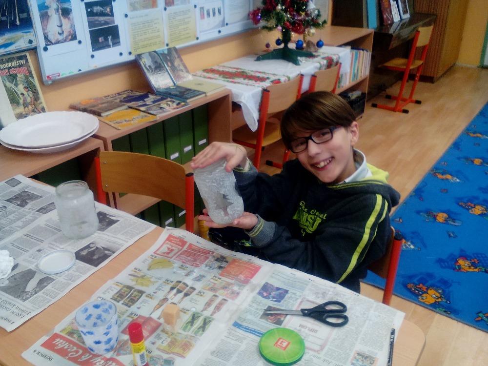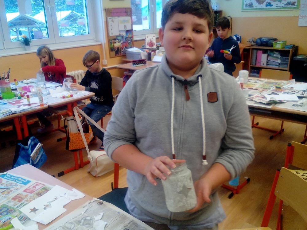 Těsně před vánočními svátky se u nás ve třídě opět konala dílnička, kde se vyráběly drobné dárky. Paní Zettlová si pro nás přichystala lucerničku s nevšedním zdobením za pomoci zubní pasty a dekoraci na vánoční stůl z ubrousku. Na vyrábění jsme měli vyčleněny jen dvě vyučovací hodiny, takže jsme museli přesně poslouchat pokyny a pracovat pilně, aby se vše povedlo. Naší odměnou byly pěkné výrobky. Děkujeme tímto paní Zettlové, která si na nás vždy udělá čas.