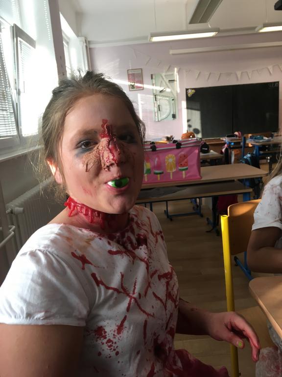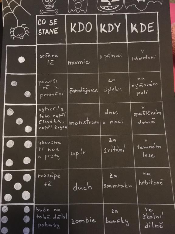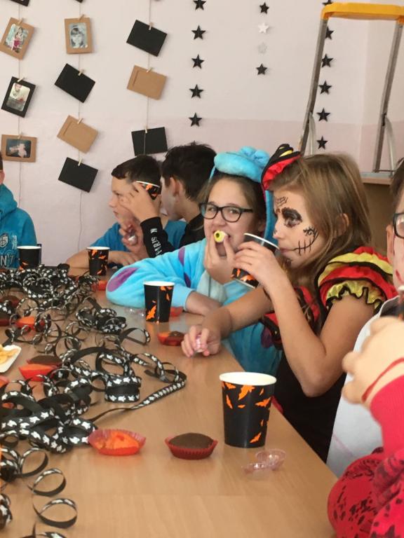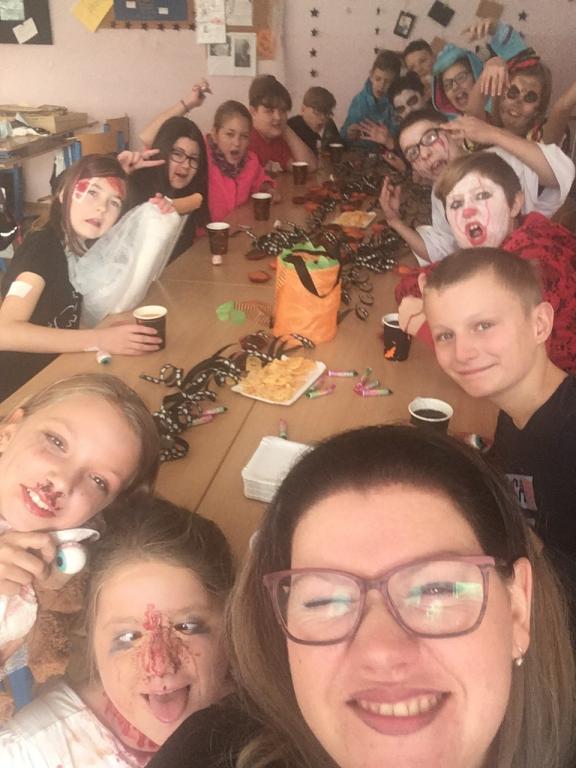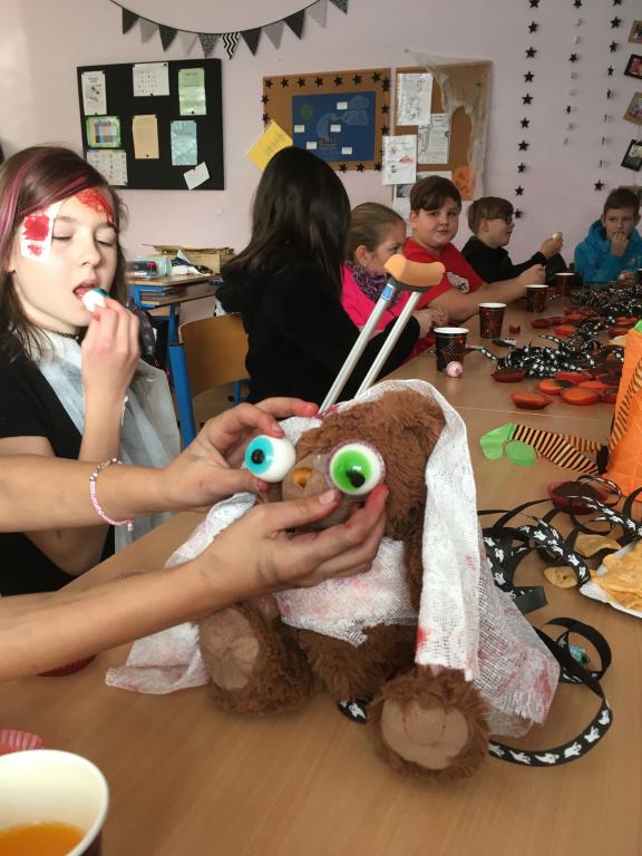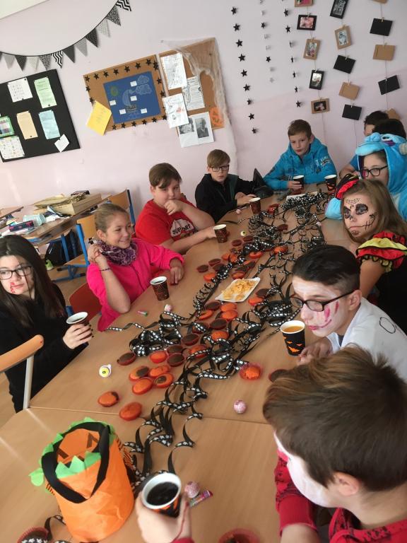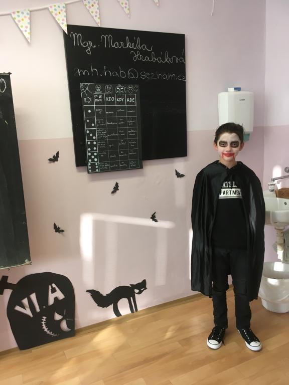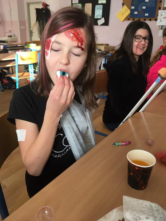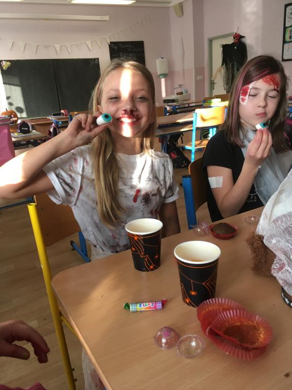 Ač nepatří Halloween mezi české svátky, dohodli jsme se, že si tento den ozvláštníme a přichystáme si kostýmy. A co by to bylo za Halloween bez koledy! Na strašidla z VI.A čekaly různé dobroty – želatinová očka, křupaví duchové, odvar z netopýra a dračí žluč! MŇAM! A navíc paní učitelka pro své dušičky napekla sladké a voňavé muffiny. A jako pořádné překvapení přinesla Simča Oswaldová dvě pořádně zašklebené velké dýně! Společně jsme pak hodovali a pili a dobrou zábavu spolu měli. A jestli jsme všechno nesnědli, strašíme tam dodnes!