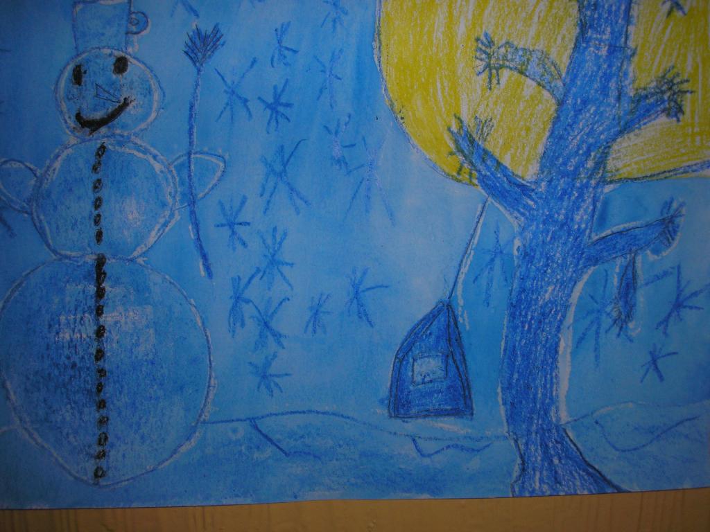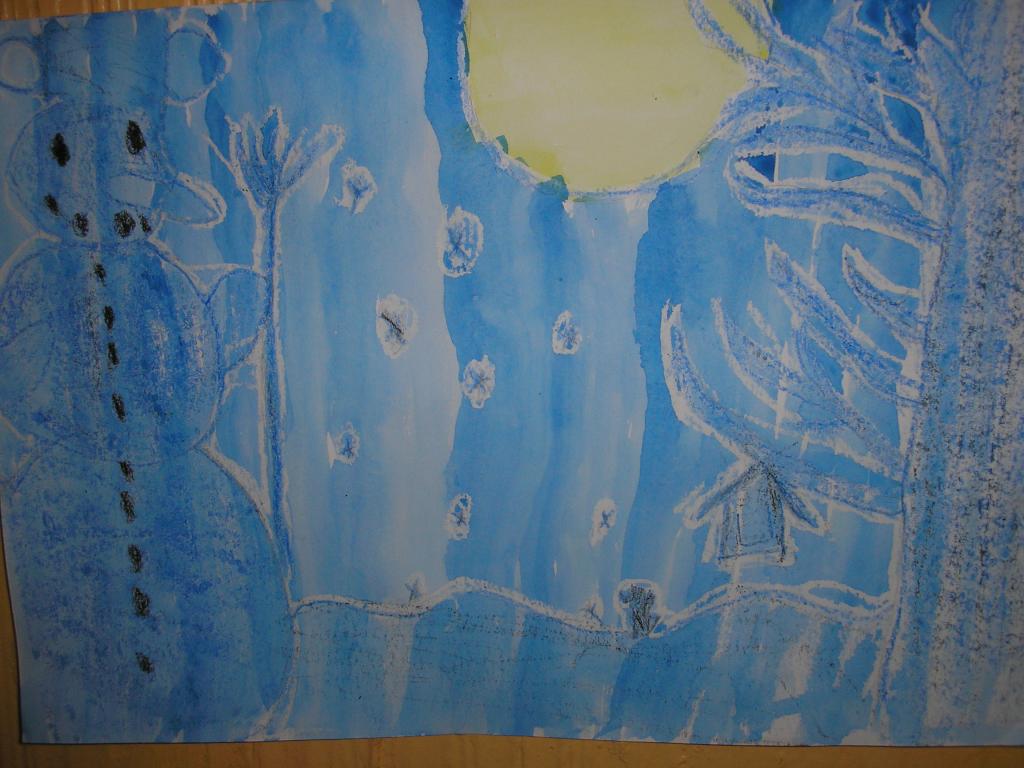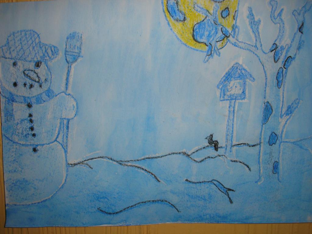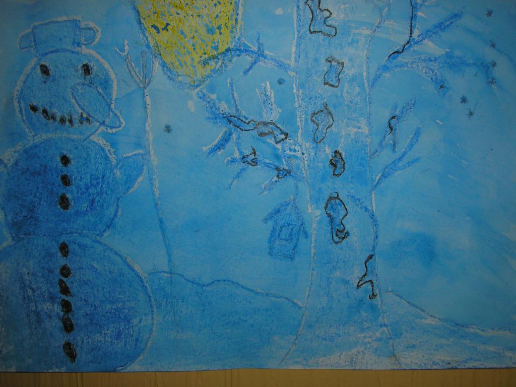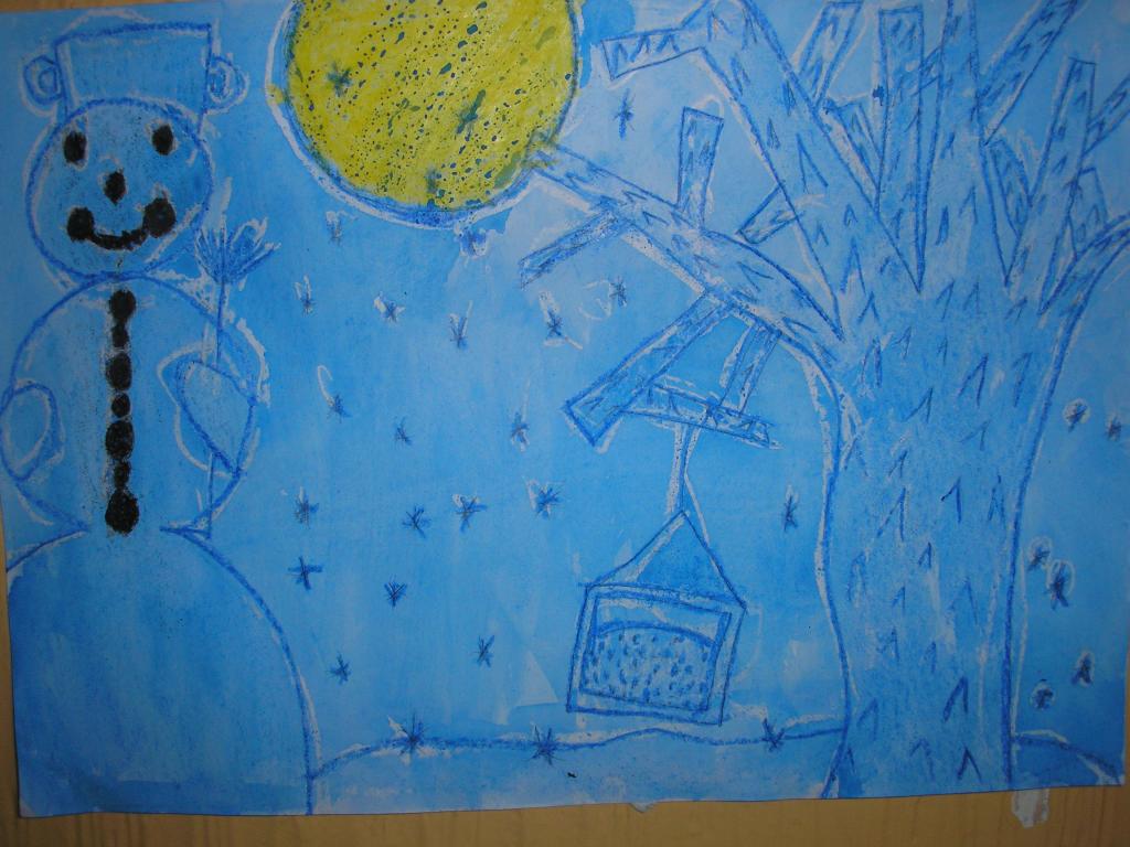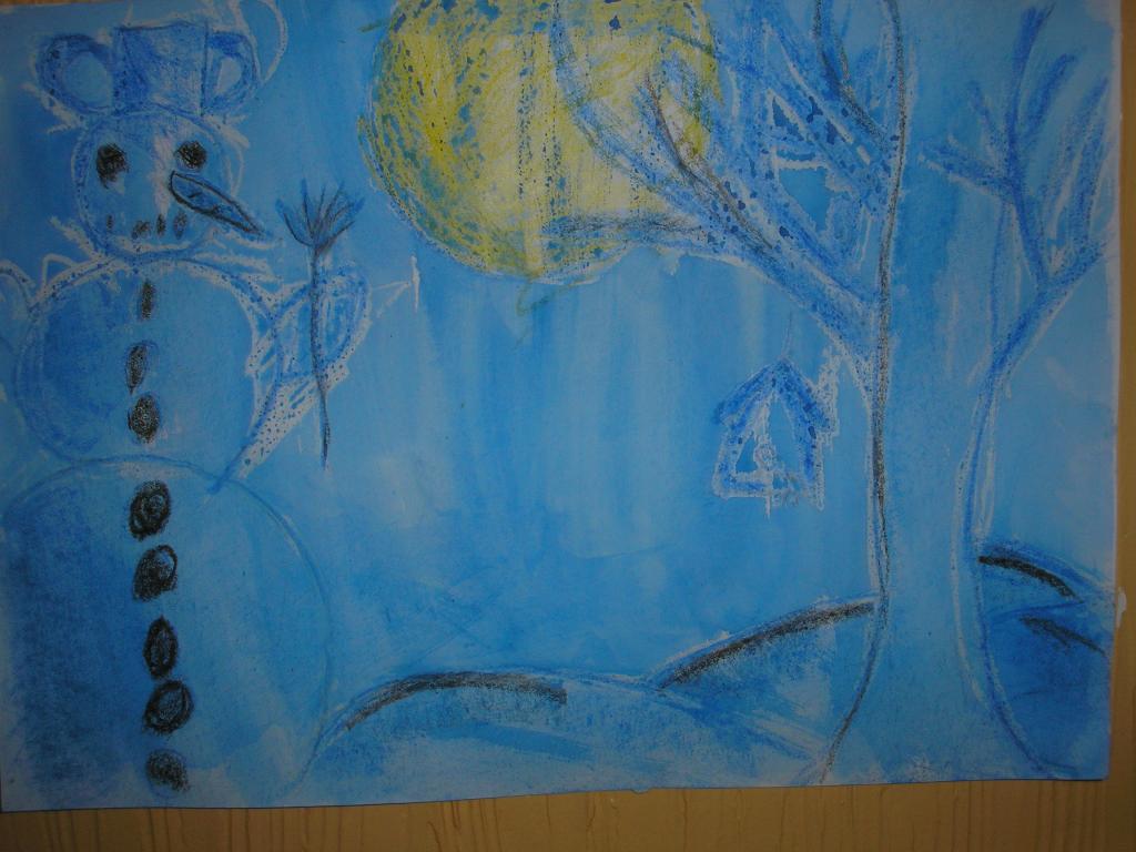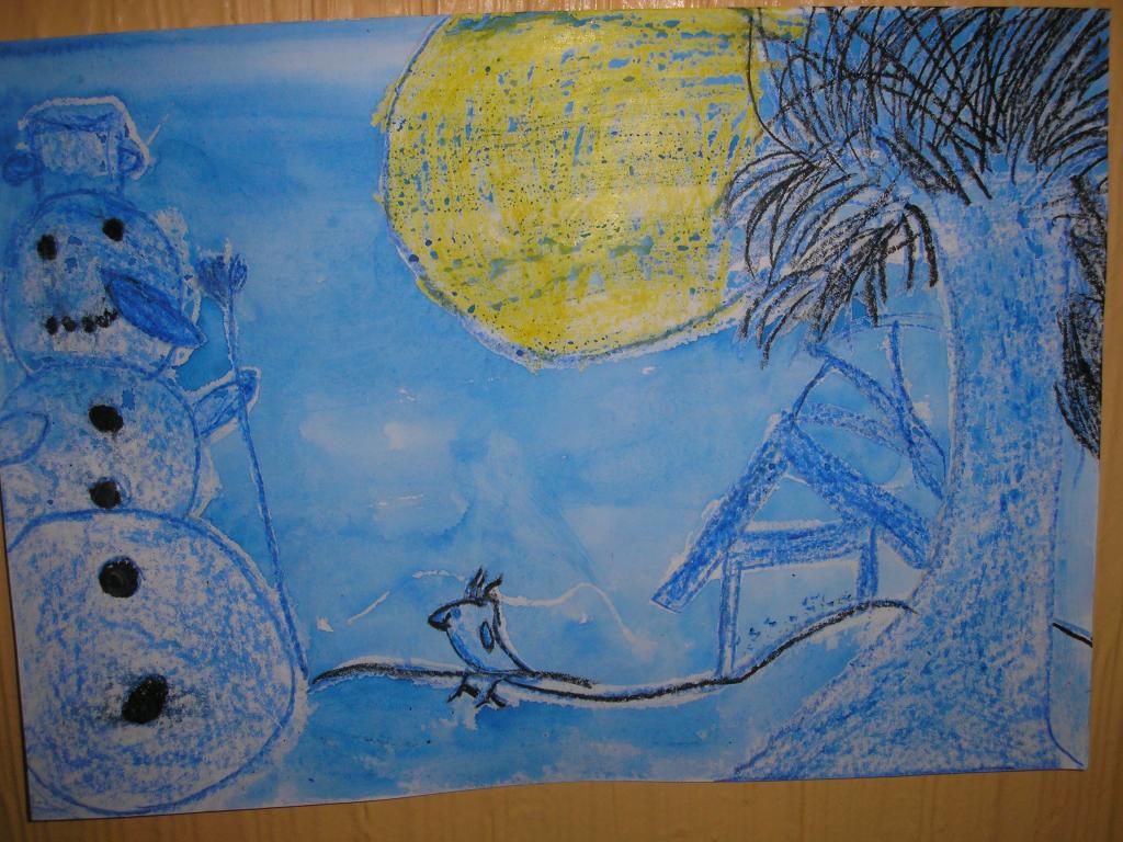 V hodinách výtvarné výchovy jsme pracovali s vodovými barvami a voskovkami. Pomocí voskovek jsme docílili pěkného efektu. Snažili jsme se namalovat zimní noční krajinu se sněhulákem v úplňku.