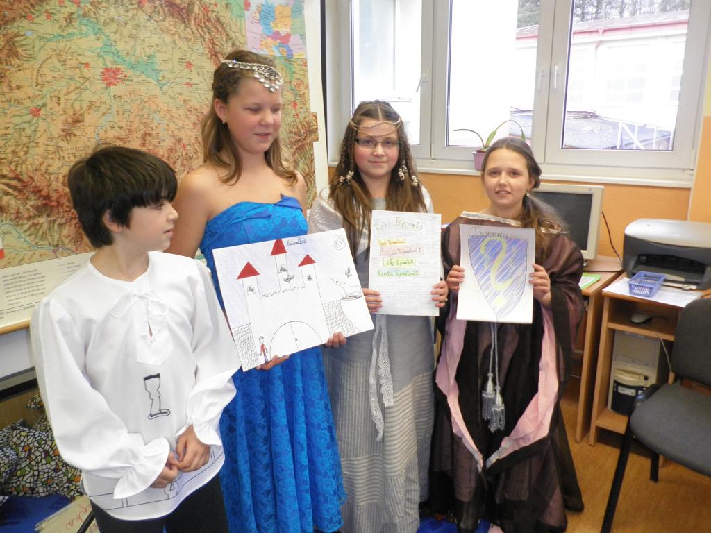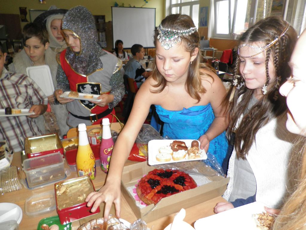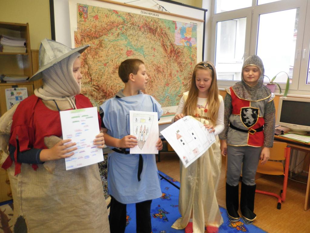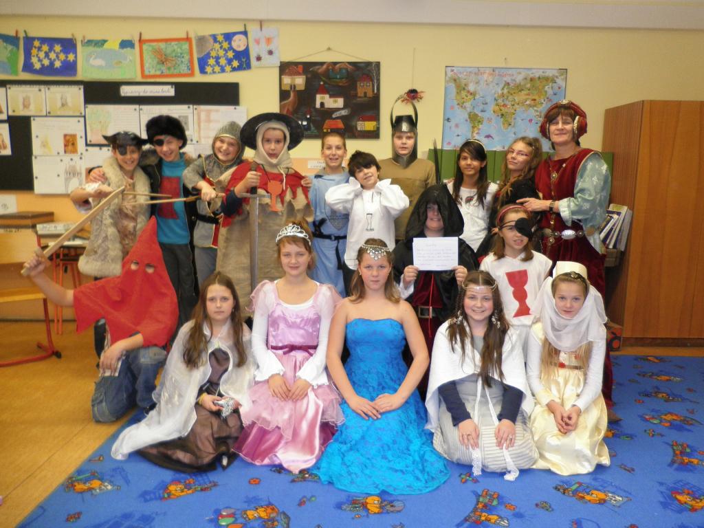 Naše rytířské a husitské klání se konalo dne 4.11., kostýmy ve třídě se to jen hemžilo. K rytířskému stolu jsme usedli v 8 hodin, jídla a pití bylo hojně. Kromě hodování jsme ale dělali i jiné zajímavé činnosti. Například jsme si ve skupinách navrhli hrad: kde bude stát, co se v blízkosti nachází atd. Také jsme si společně vytvořili erb a sestavili rodokmen hradních pánů. Dobrým nápadem bylo psaní dopisů panovníkům a panovnicím, ve které době bychom chtěli žít, co se nám na ní líbilo a co bychom chtěli změnit. Velmi veselým zážitkem byl sborový zpěv písně Hoja hoj z filmu Noc na Karlštejně. Domů jsme odcházeli s dobrou náladou a skvělým zážitkem.