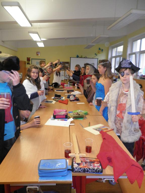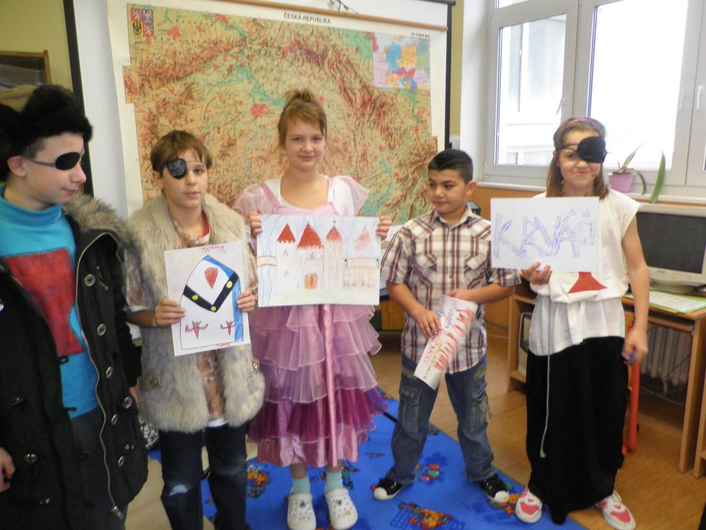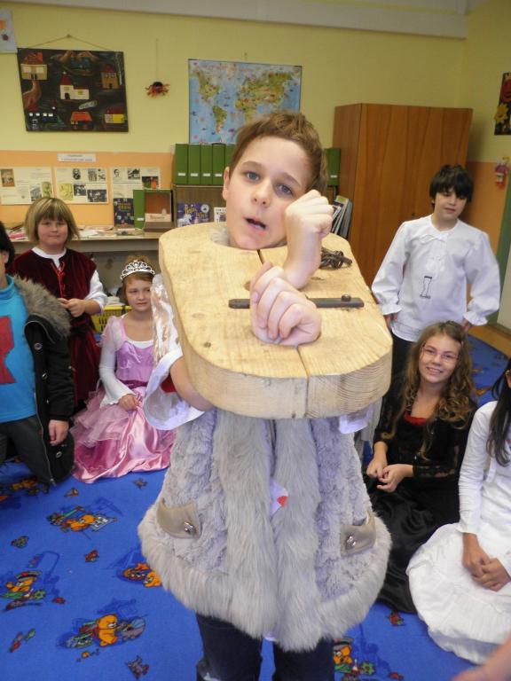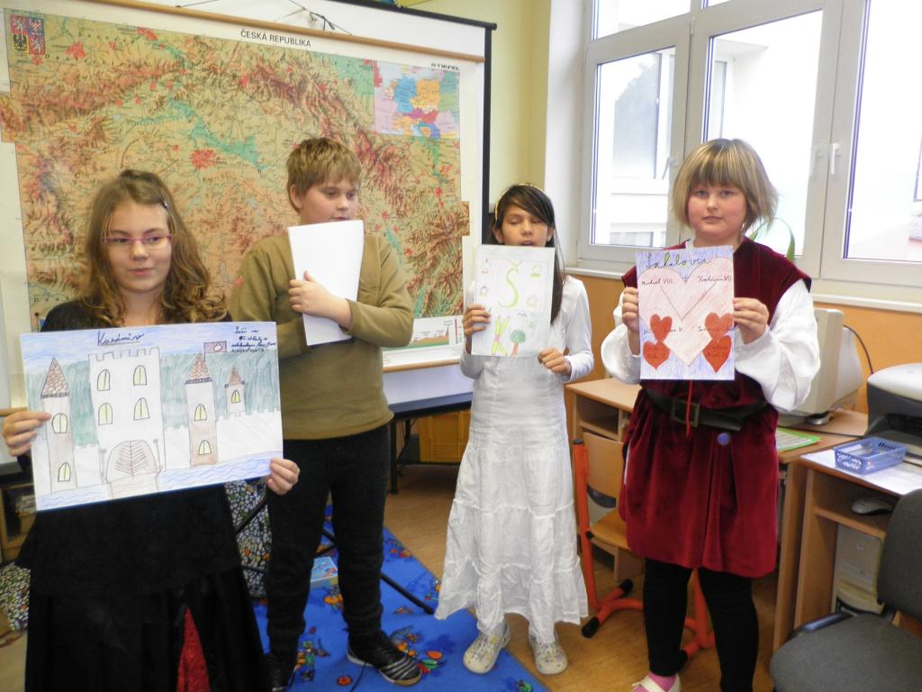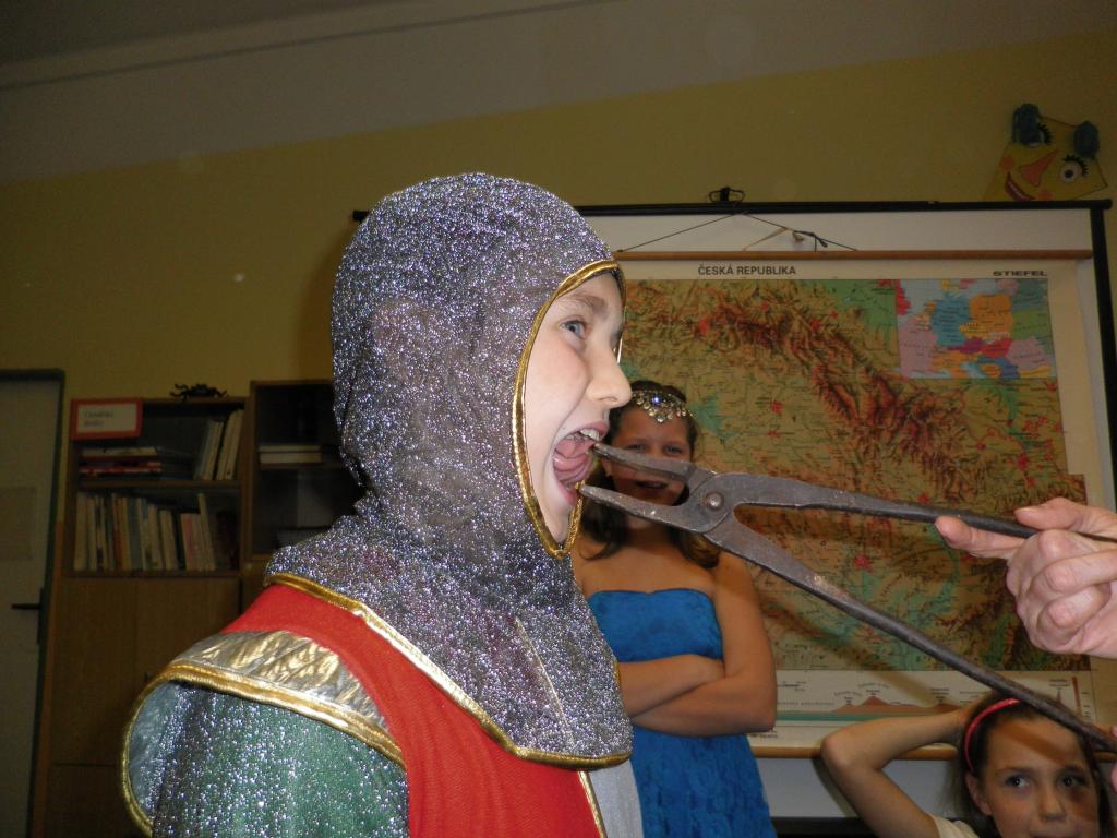 Naše rytířské a husitské klání se konalo dne 4.11., kostýmy ve třídě se to jen hemžilo. K rytířskému stolu jsme usedli v 8 hodin, jídla a pití bylo hojně. Kromě hodování jsme ale dělali i jiné zajímavé činnosti. Například jsme si ve skupinách navrhli hrad: kde bude stát, co se v blízkosti nachází atd. Také jsme si společně vytvořili erb a sestavili rodokmen hradních pánů. Dobrým nápadem bylo psaní dopisů panovníkům a panovnicím, ve které době bychom chtěli žít, co se nám na ní líbilo a co bychom chtěli změnit. Velmi veselým zážitkem byl sborový zpěv písně Hoja hoj z filmu Noc na Karlštejně. Domů jsme odcházeli s dobrou náladou a skvělým zážitkem.