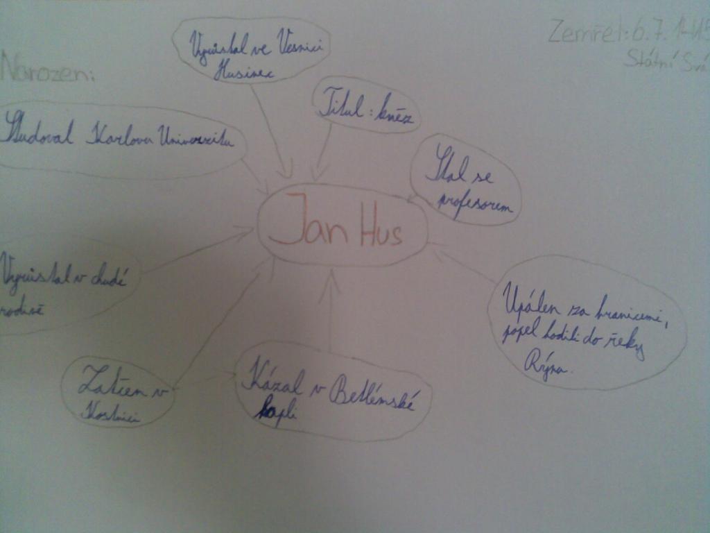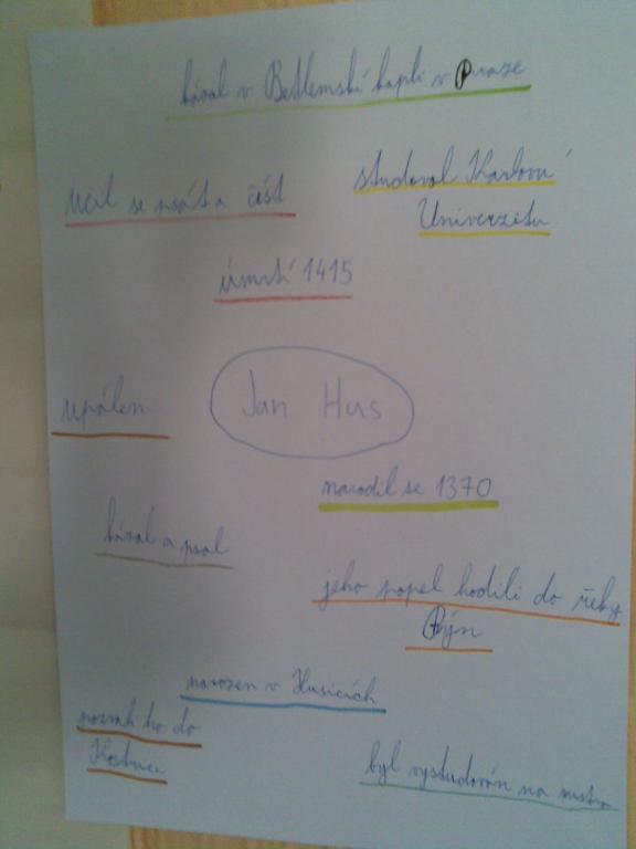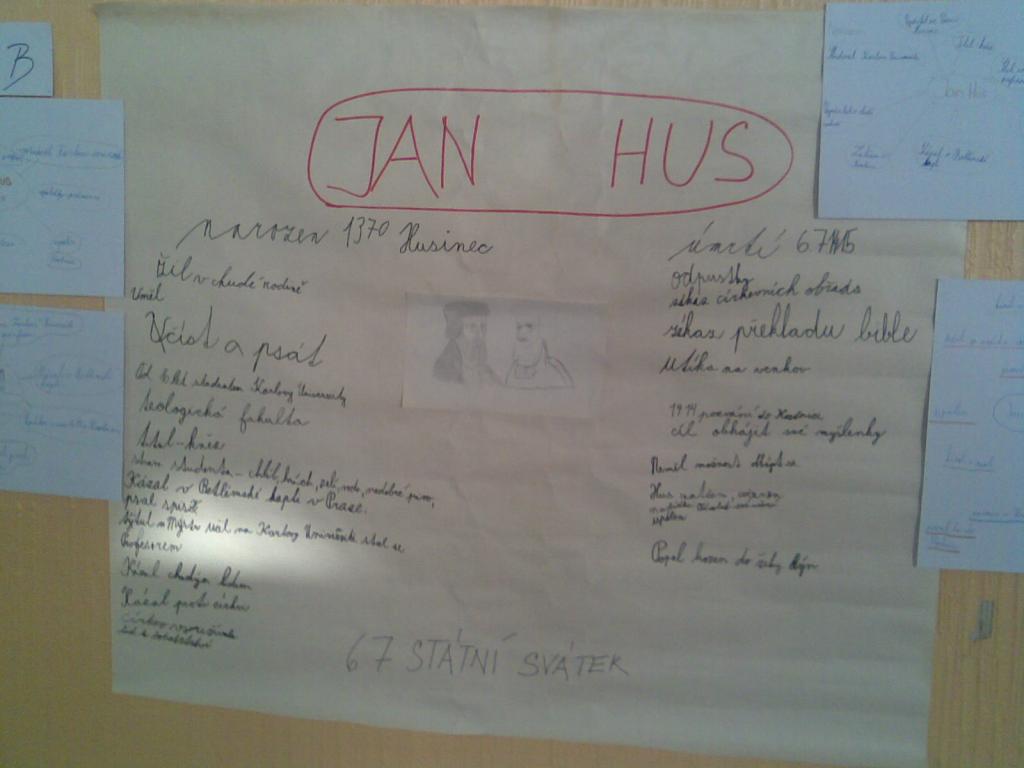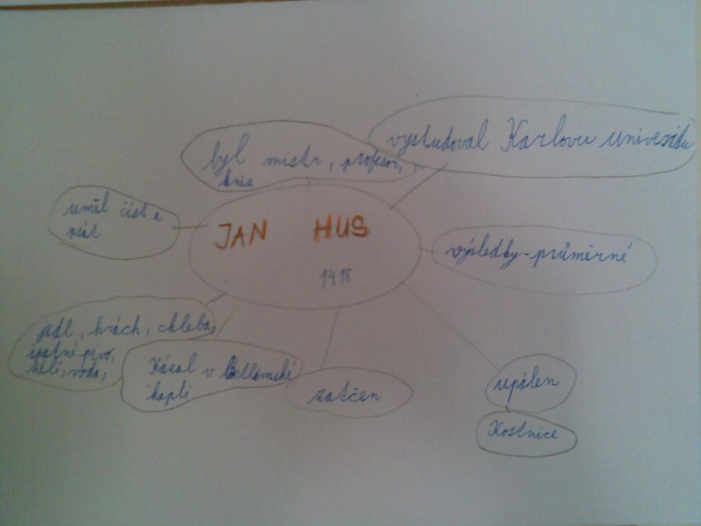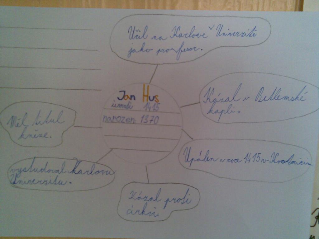 V rámci hodin vlastivědy jsme se zabývali významnou osobností našich dějin. Žáci měli za úkol zjistit informace o Janu Husovi – narození a úmrtí, dětství, vzdělání, myšlenky kázání, apod. V následující hodině jsme si postupně sdělovali informace, které žáci zjistili. Zároveň jsme společně vytvářeli myšlenkovou mapu, do které jsme zapisovali vše, co víme o významném kazateli a Mistrovi Janovi Husovi.