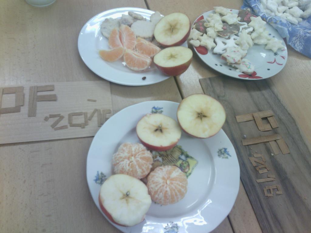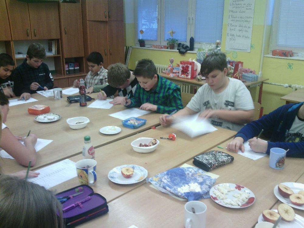 Letos jsme si již popáté chystali a zdobili třídu na vánoční posezení. Tentokrát byla výzdoba připravena a vyrobena samotnými dětmi v hodinách VV, AJ a čtení. "Tradice a Vánoce v různých zemích", to jsme se dočetli v různých knihách, také jsme zúčastnili výchovného pořadu na téma Tradice českých Vánoc a koled. O tom, jak slavili vánoční svátky v Anglii, nám vyprávěl Daniel Holub, který v Anglii několik let žil se svými rodiči. Nechyběly dárky a byla i nějaká ta vánoční dobrota na stole. Jelikož se již třetím rokem zajímáme o zdravou stravu, zvolili jsme pohoštění jako studenou kuchyni a udělali jsme si ovocné talíře. Každý donesl co mohl, a společně jsme si vše nachystali. Dopoledne bylo dlouhé, a tak jsme se i učili, - hravě a zábavně - nás paní učitelka naučila jak rýsovat různé hvězdy. Zdokonalili jsme se v manipulaci s kružítkem i pravítky. Napsali jsme si vánoční pozdrav v angličtině, zasoutěžili si o dobrůtku, a ještě jsme si pro rodiče nachystali z dřevěné dýhy PF 2016. Radost z dárků a blížících se prázdnin byla obrovská. Nezapomněli jsme ani na vedení školy, kam jsme zanesli za třídu přání, žáci zašli i za ostatními vyučujícími s malým andělíčkem a popřáli jim.