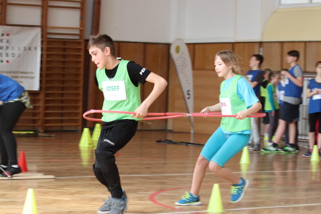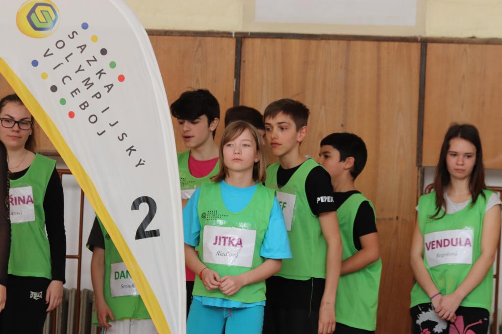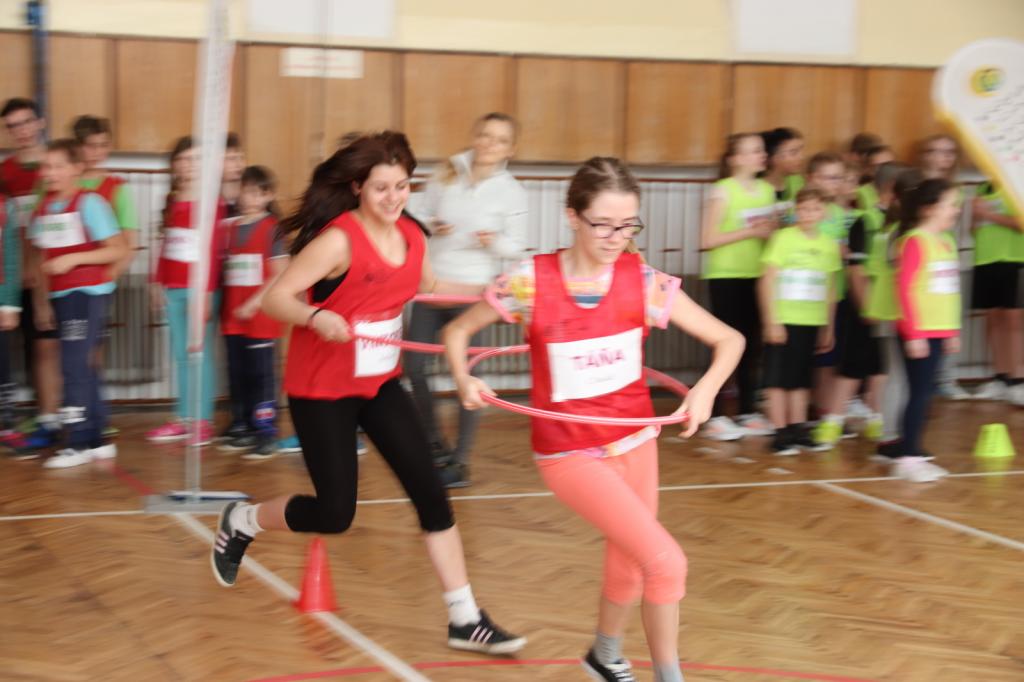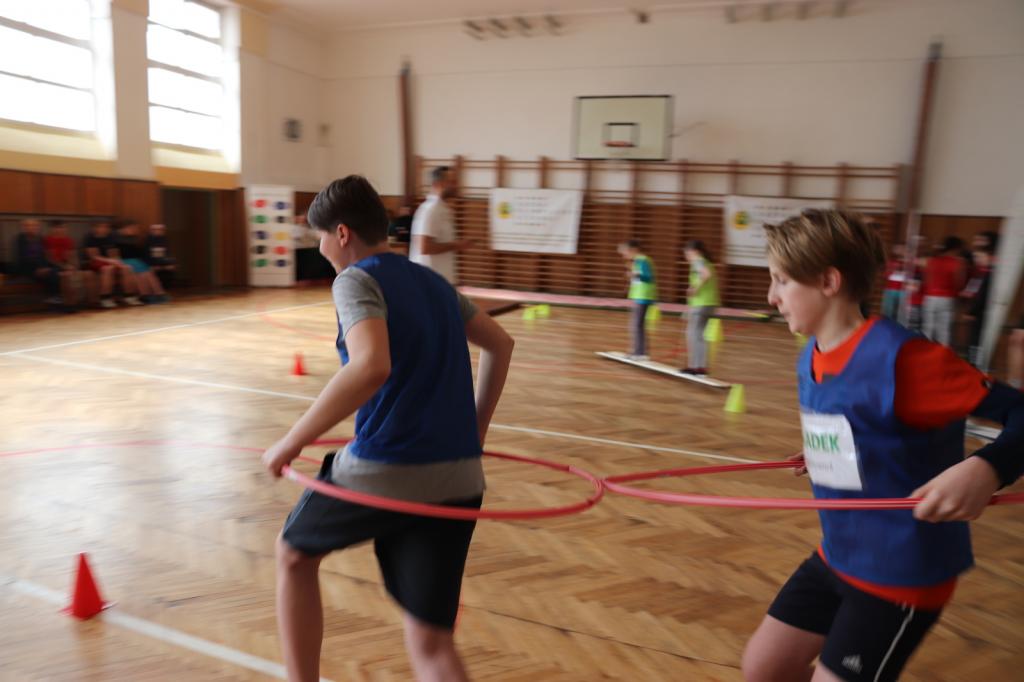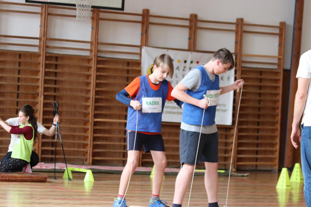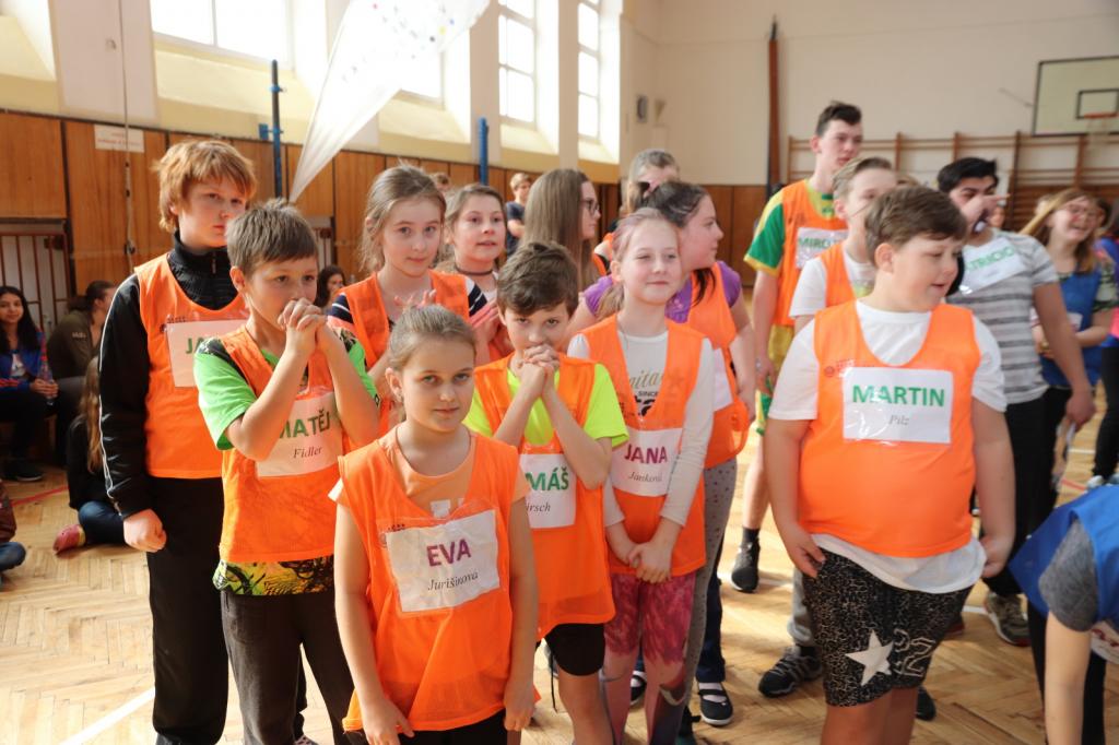 Leccos jsme již měli nacvičeno z minula. Asi osmdesátka aktivních účastníků sportovního klání a tréninku se zčásti obměnila, aby dostaly šanci i nové tváře. Vše začalo rozdělením do pěti barevných družstev, v nichž se opět setkali třeťáci až deváťáci. Všichni byli označeni rozlišovákem a jmenovkou pro lepší komunikaci. Nutno podotknout, že spolupráce žáků bez rozdílu věku znovu zafungovala bezvadně a to vidíme jako velkou přidanou hodnotu tohoto formátu akce. Kooperace a vzájemná pomoc a povzbuzování mezi až o šest let staršími dětmi se totiž nevidí každý den.