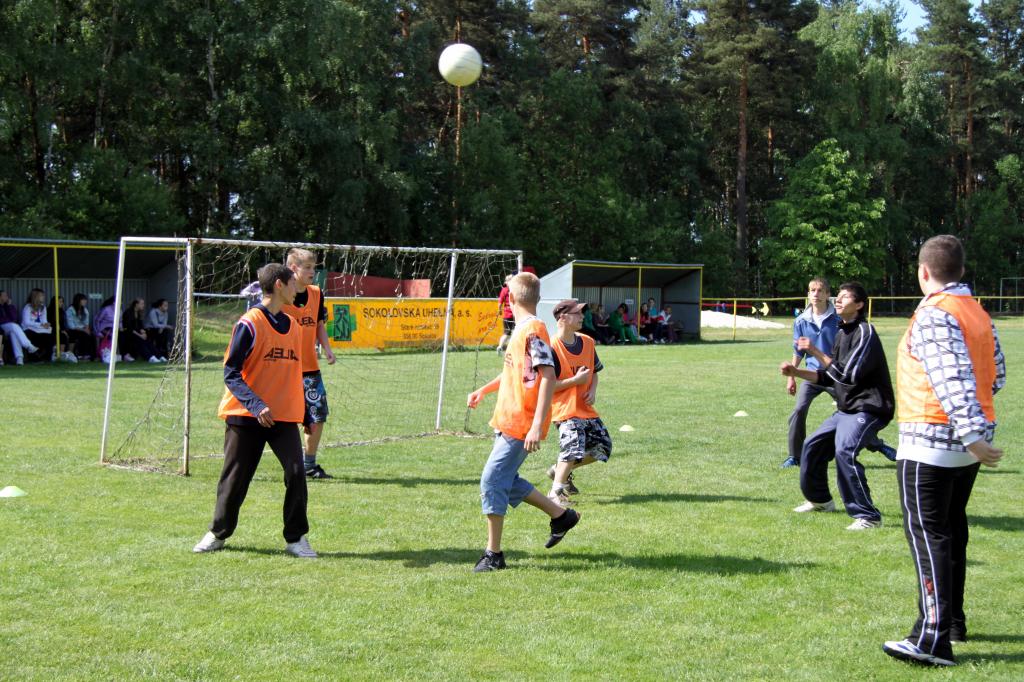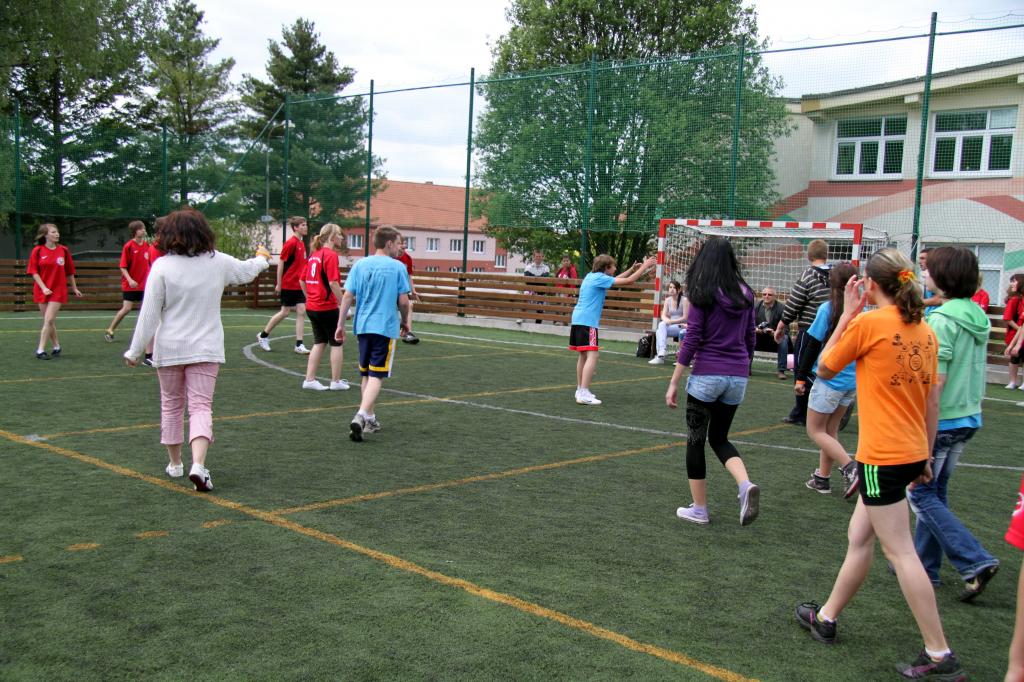 Pro žáky 6.-9. tříd to znamenalo utkat se během dopoledne v rámci paralelních tříd postupně ve vybíjené, kopané, basketbalu a volejbalu. V současnosti máme však jen jednu šestku a jednu devítku, a tak stejně jako v loni získalo naše sportovní klání mezinárodní nádech, neboť jsme našim třídám pozvali jako soupeře žáky z partnerské školy v saském Lengenfeldu. Ti však dorazili o něco později, a proto odehráli pouze tři sporty. Celé klání krátce po osmé zahájil pan starosta Zemek a pan ředitel Mgr. Riedl, kteří všem také zároveň popřáli vše nejlepší, a šlo se na věc.