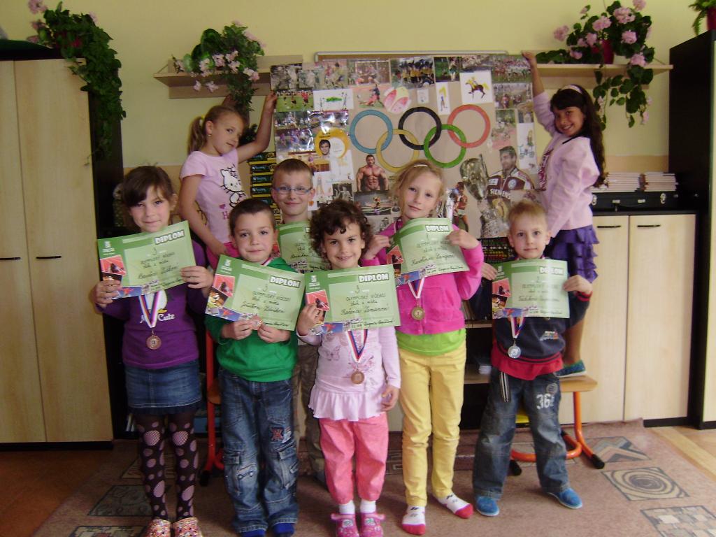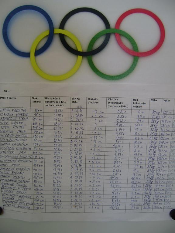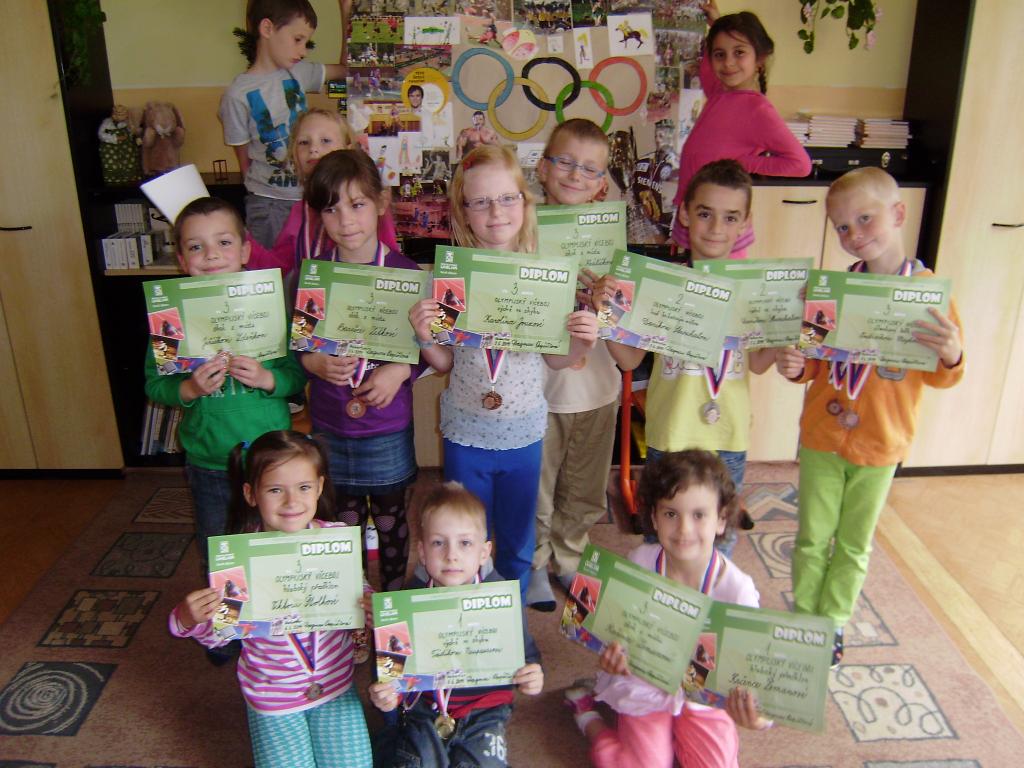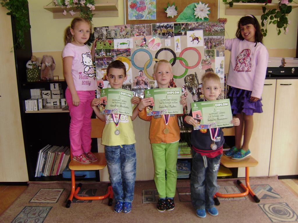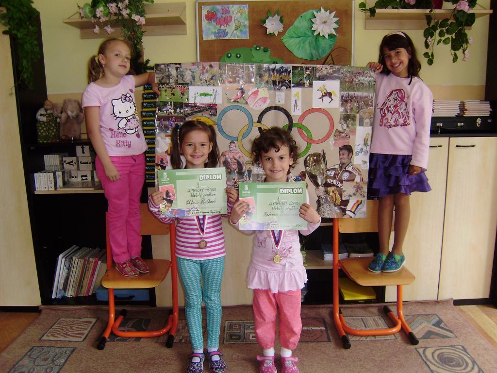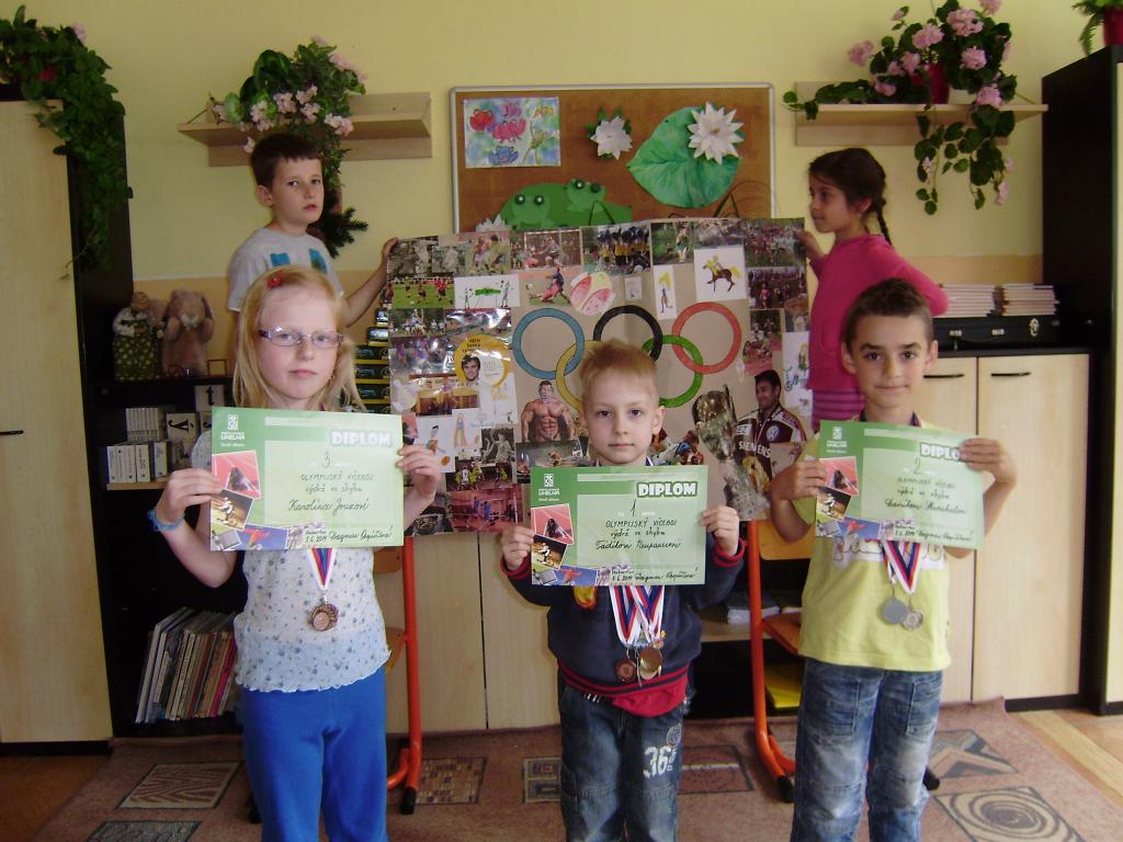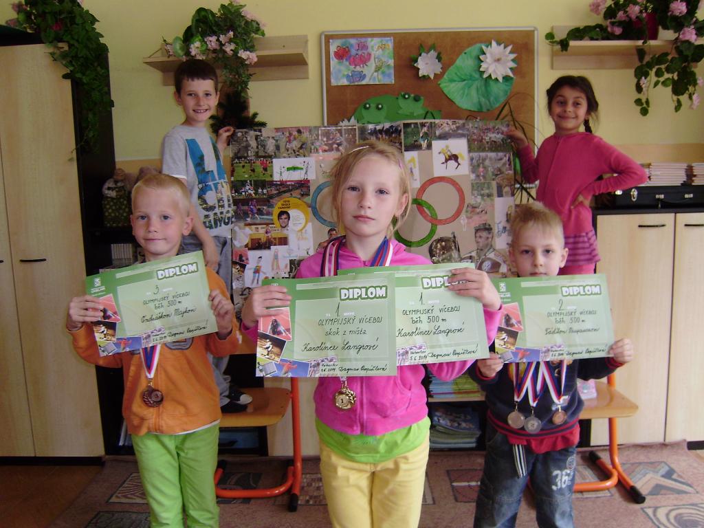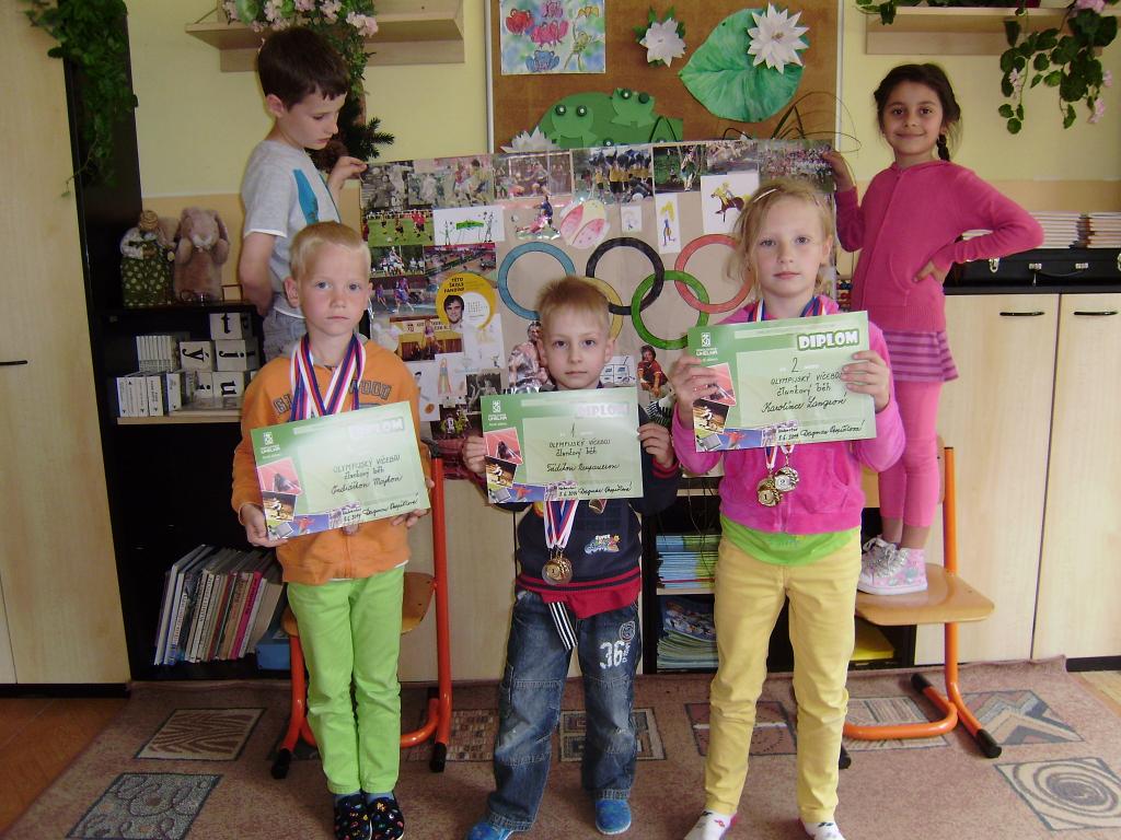 V úterý 8. dubna 2014 jsme zahájili Olympijský víceboj naší hymnou. V hodinách výtvarné výchovy jsme si vyrobili naši olympijskou vlajku. Děti se velice těšily na sportovní disciplíny. Při první tělesné výchově jsme si vyzkoušeli jakou máme odrazovou sílu. V dalších hodinách jsme prověřili naši vytrvalost, sílu paží, rychlost a ohebnost. Všichni se nemohli dočkat závěrečného vyhlášení vítězů. Dne 5. června byl náš Olympijský víceboj ukončen. Ve skoku z místa byli nejlepší: Karolínka Langrová (140 cm), Tádík Neupauer (130 cm), Honzík Králíček, Jiřík Zdeněk, Kačenka Zemanová a Baruška Zítková (120 cm). Člunkový běh vyhrál Tádík Neupauer, druhá byla Karolínka Langrová a třetí Ondrášek Majka. Nejtěžší disciplínou byla výdrž ve shybu nadhmatem. Zlatou medaili získal Tádík Neupauer, stříbrnou Daník Strouhal a bronzovou medaili vybojovala Karolínka Jouzová. Kdo zvládl nejlépe běh na 500m? Na stupínek vítězů se probojovali Karolínka Langrová, Tádík Neupauer a Ondrášek Majka. V hodu kriketovým míčkem byl první Ondrášek Majka, druhý Daník Strouhal a třetí Tádík Neupauer. Za hluboký předklon získala zlatou medaili Kačenka Zemanová, stříbrnou Kačenka Kratochvílová. Bronzová medaile ozdobila Viktorku Štolkovou. Už se těšíme na další nejen sportovní soutěže.