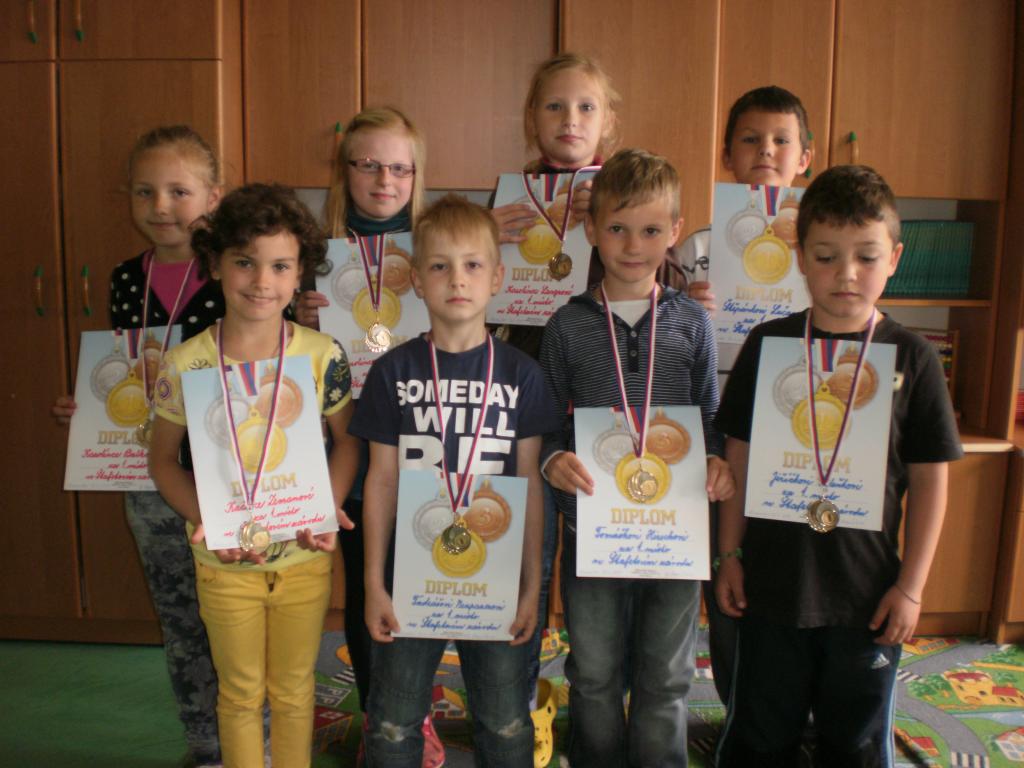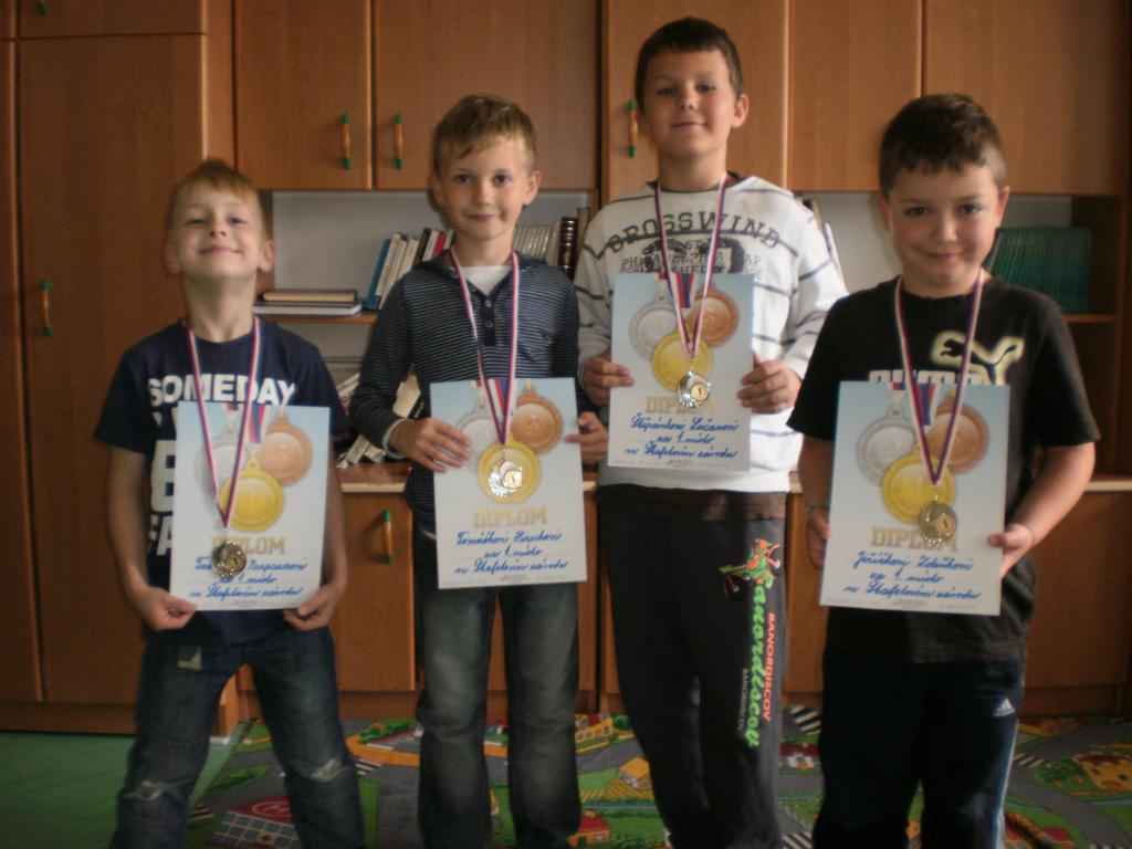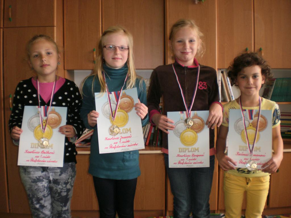 Naučili jsme se předávat štafetové kolíky, a protože jsme moc šikovní, uspořádala pro nás naše paní učitelka závod. A jak to dopadlo? Výkony byly velice vyrovnané. Na pomyslný stupeň vítězů vystoupila a zlaté medaile vybojovala štafeta ve složení: Karolína Langrová, Karolína Jouzová, Kateřina Zemanová a Karolína Balková. Nejúspěšnější štafetu chlapců utvořili: Tadeáš Neupauer, Tomáš Hirsch, Štěpán Lučan a Jiří Zdeněk. Gratuluji.
