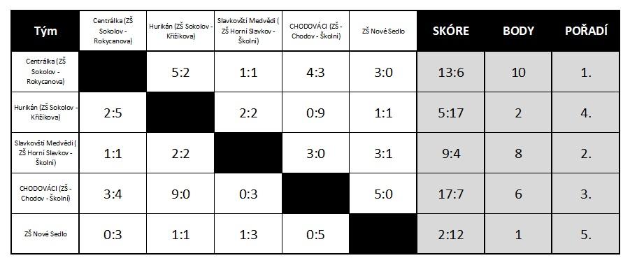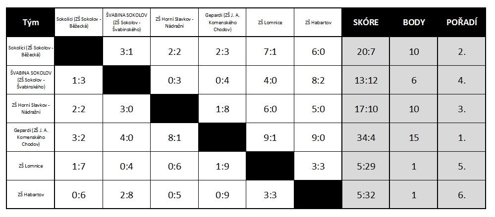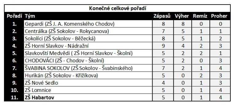 Přestože se nám zrovna nedařilo, kluci bojovali v každém zápase i proti výrazně zkušenějším týmům složených většinou z florbalistů. Bohužel jsme skončili v naší tabulce na posledním místě jen s jednou remízou. I tak jsem na kluky pyšný, protože se zápas od zápasu zlepšovali. Věřím, že se jim do budoucna bude dařit lépe.